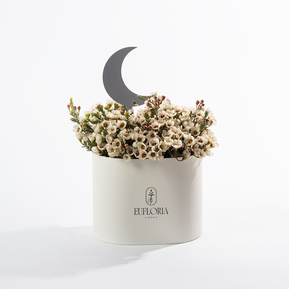 تنسيق رمضاني ناعم يتكوّن من 10 سيقان من زهرة الواكس البيضاء مرتبة بعناية داخل علبة يوفلوريا المميزة، ويتوسطه هلال بتصميم بسيط يعكس روح الشهر الكريم. ألوان هادئة ولمسة طبيعية تضيف جمالاً راقياً للمجالس أو الإهداءات الرمضانية.