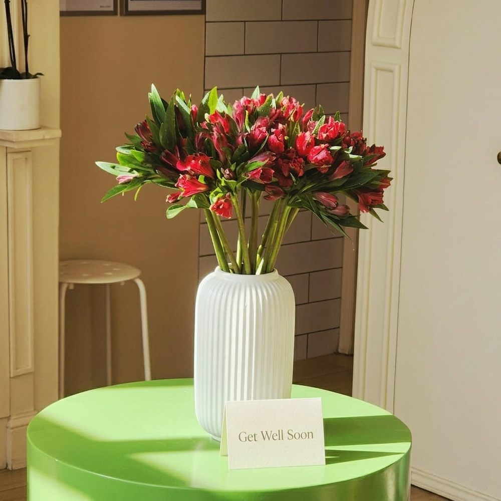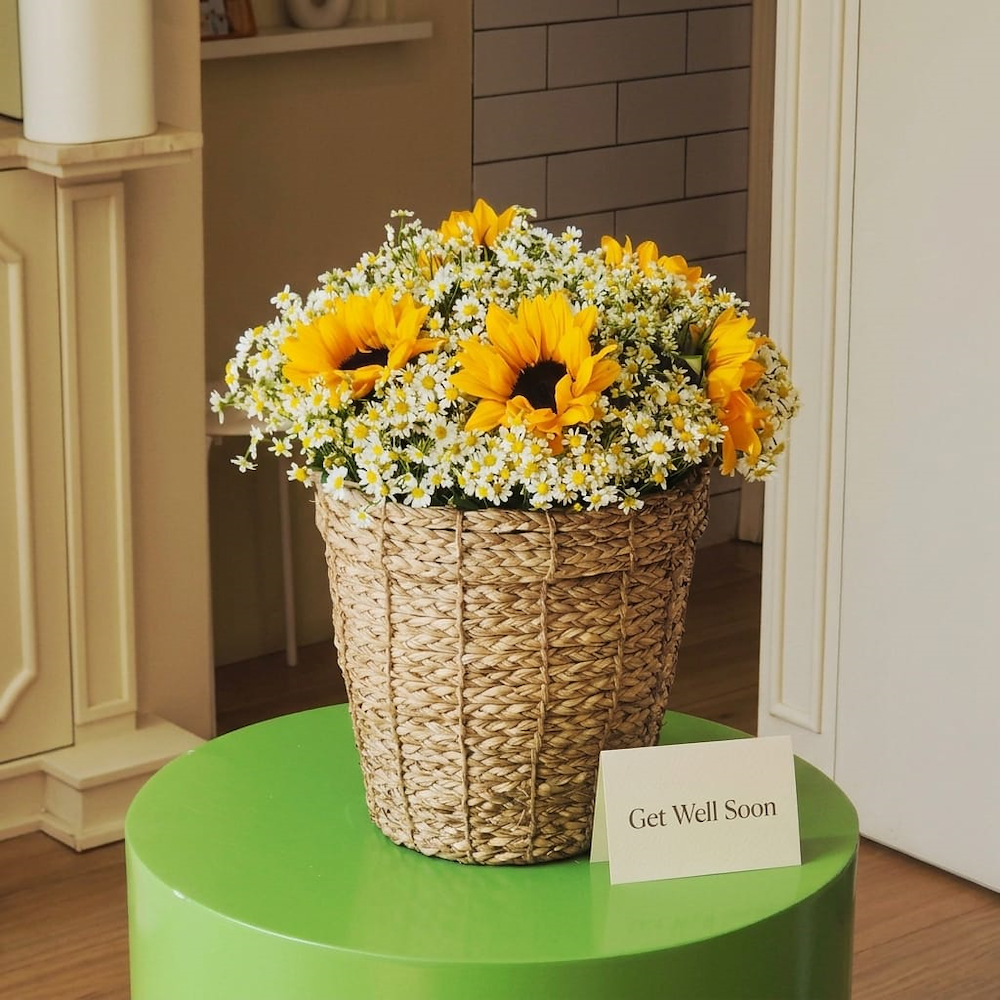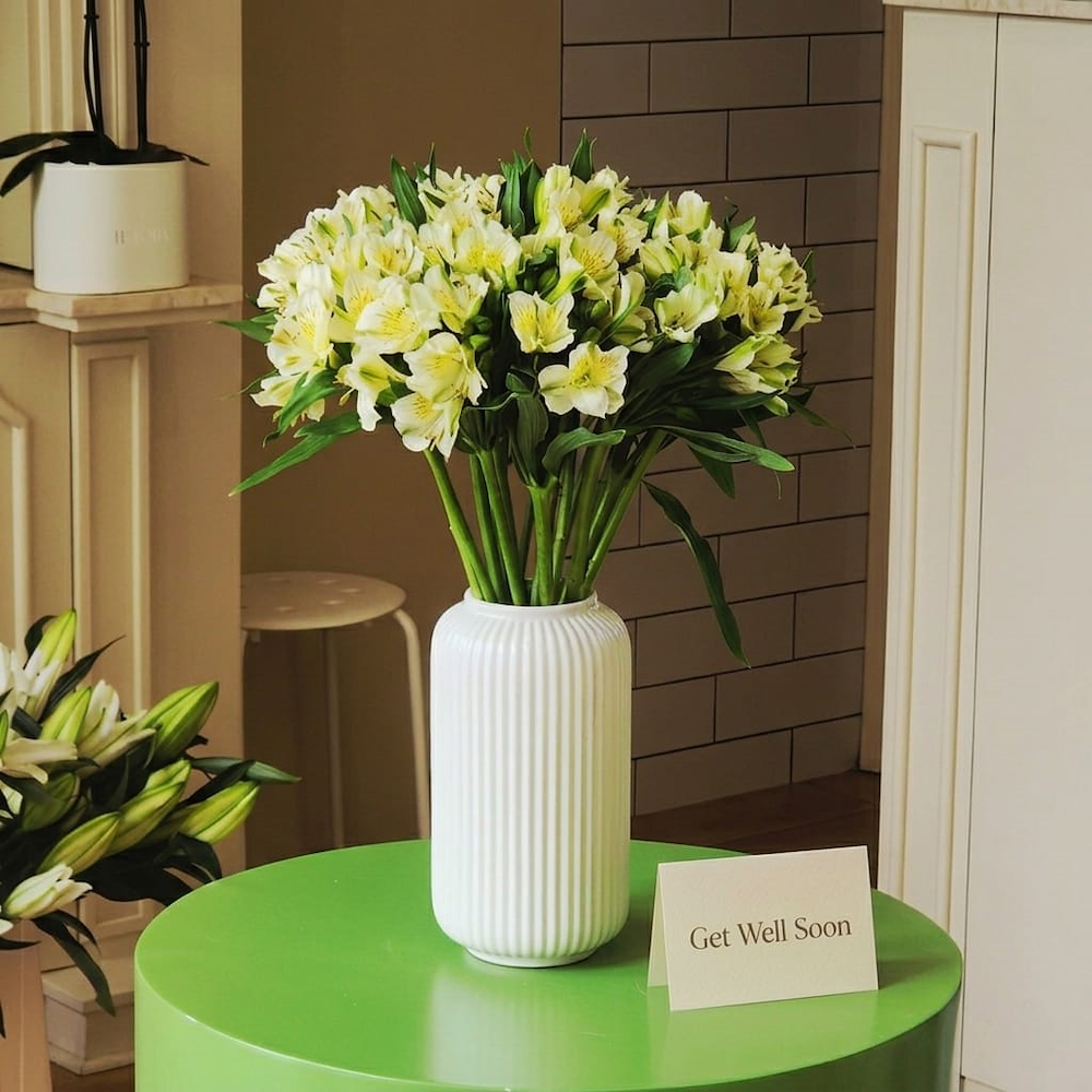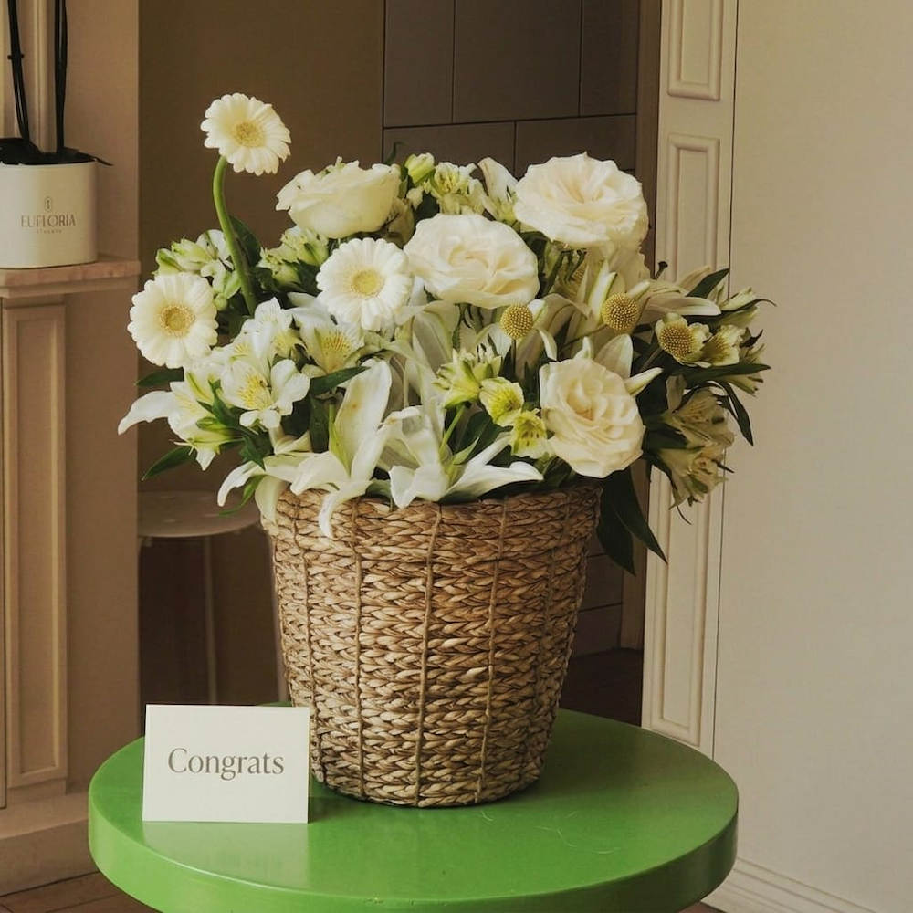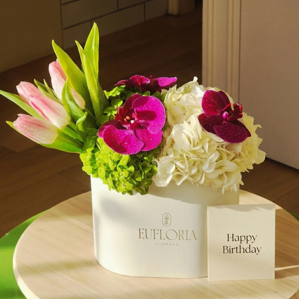 تحتوي هذه البوكس على زهرة هايدرنجا خضراء واحدة، وزهرة هايدرنجا بيضاء واحدة، و5 زهور توليب وردية، و3 زهور أوركيد ارجوانية.
