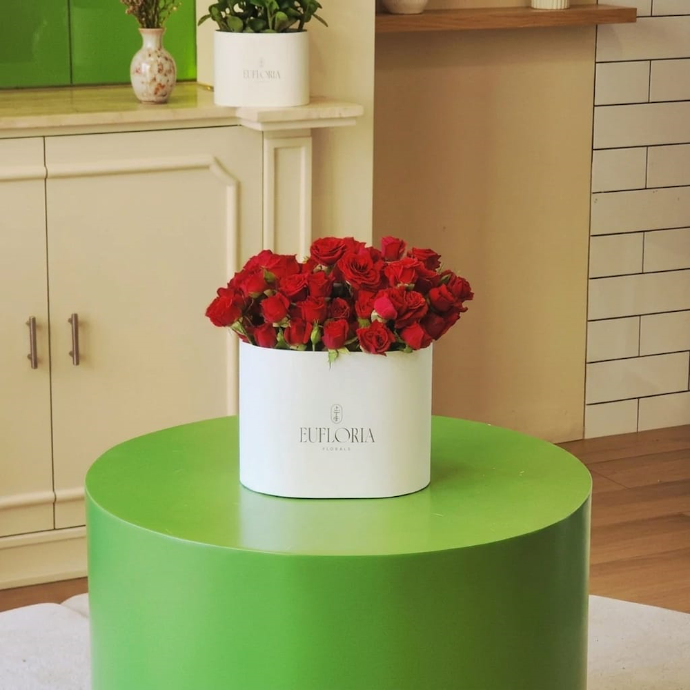 صندوق زهور يحتوي على 25 غصن من زهور البيبي جوري الحمراء، مع حقيبة مميزة.