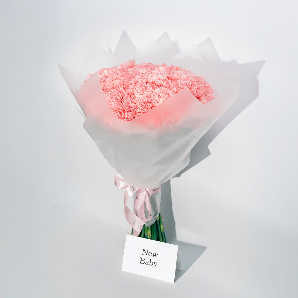 باقة يد تحتوي على زهور الكارنيشن مع حقيبة مميزة.