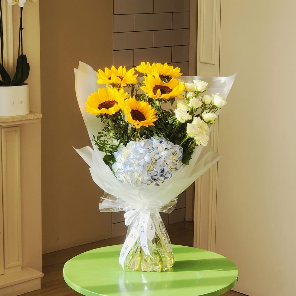 باقة يد أنيقة بأزهار دوار الشمس، البيبي جوري والهايدرنجا بتصميم أنيق.