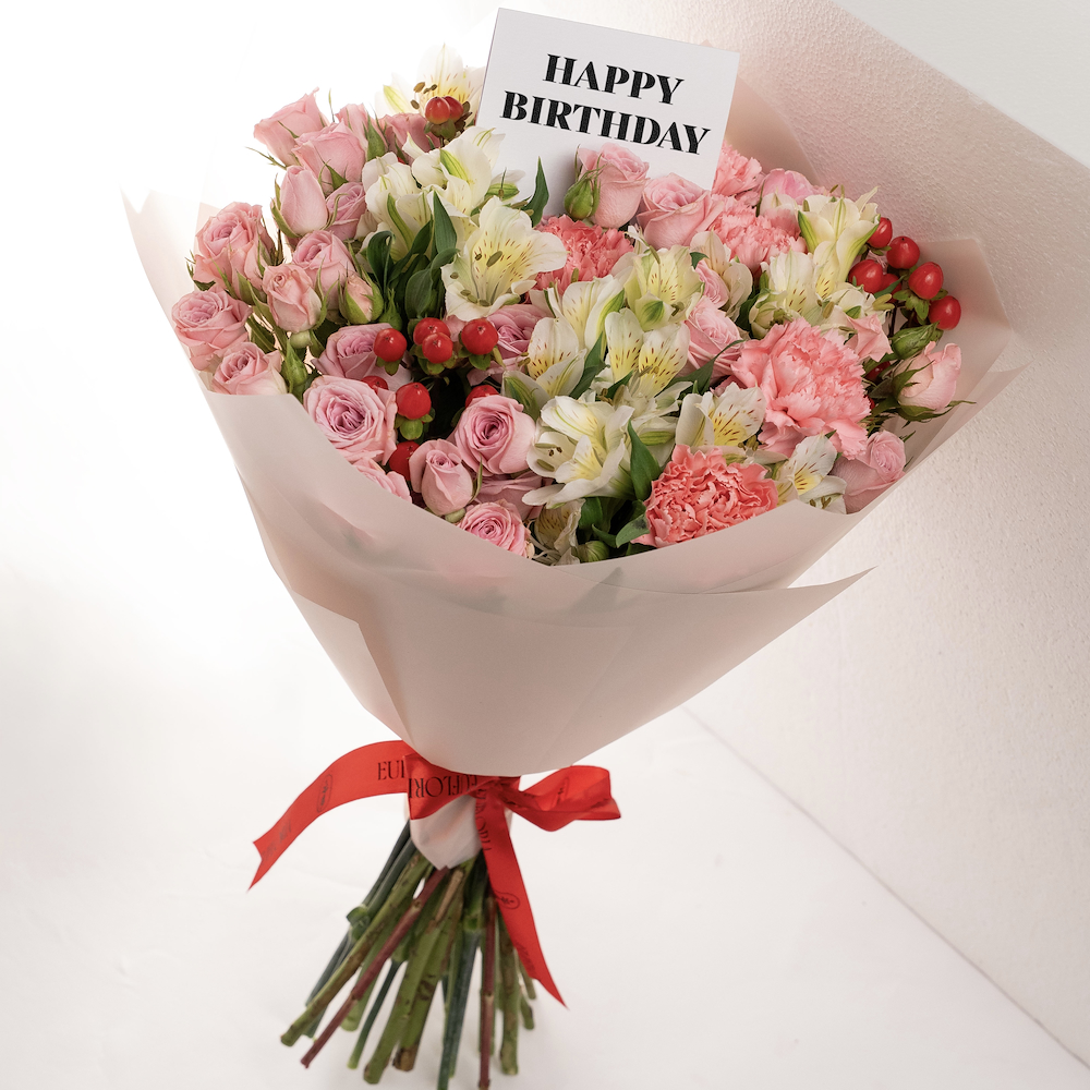 باقة يد تحتوي على زهور الألستروميريا، الجوري والكارنيشن مع الهايبريكم.
