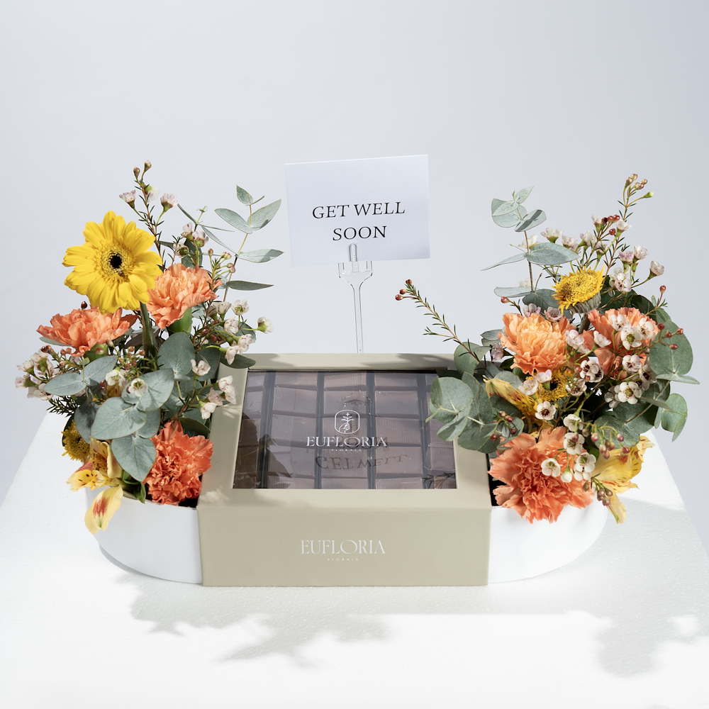صندوق حيوي يضم 50 قطعة من مربعات شوكولاتة فاخرة مرتبة على مستويين فخمين، محاط بمزيج مشرق من الأزهار الصفراء والبرتقالية، يشمل كارنيشن برتقالي، جربيرا كريزانتم باللون الأصفر، السترومريا باللون الأصفر والبرتقالي، أزهار وردية وبيضاء، وسيقان أوكالبتوس خضراء لافتة.