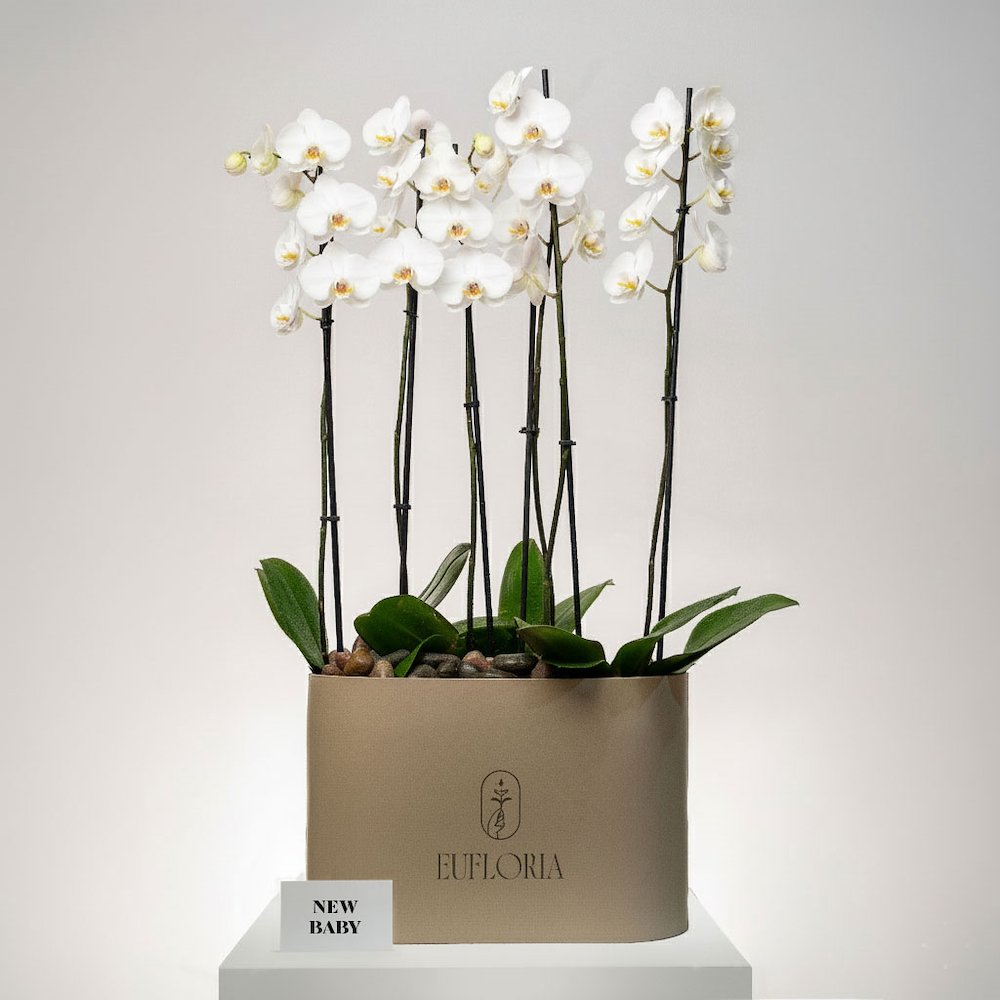 نبات الاوركيد الكبير مع ثلاثة بلانترات وستة سيقان باللون الابيض الكلاسيكي مع بوكس مزين باحجار ملونة.