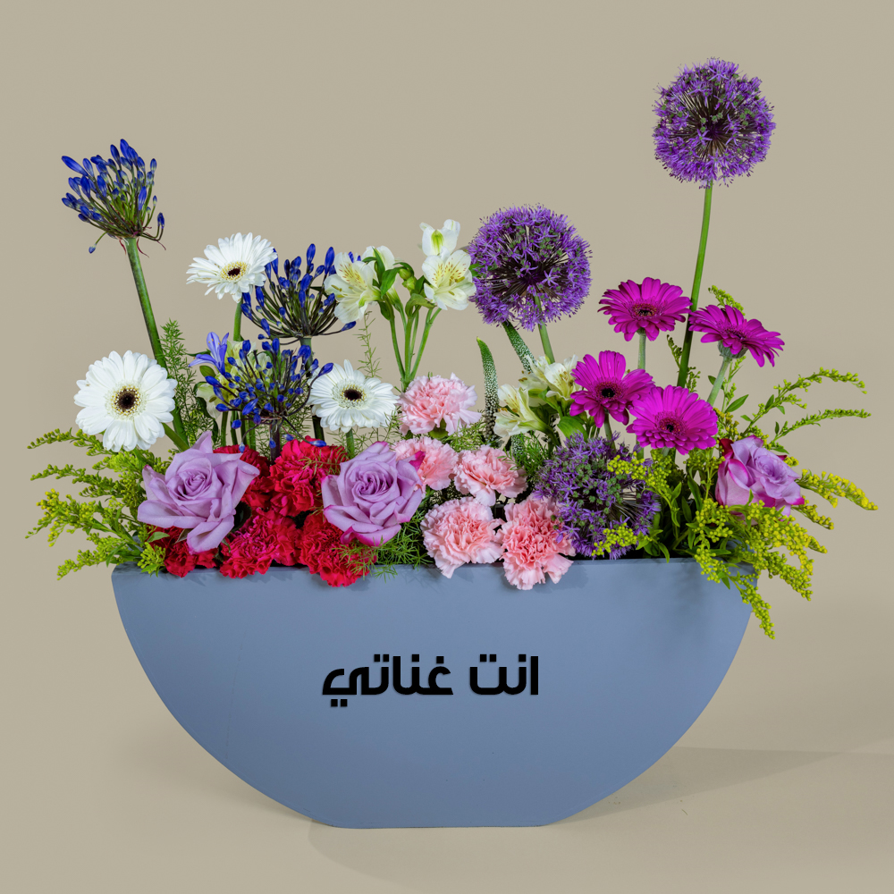 بوكس يحتوي على أزهار الآليوم، الأغابانتوس، الجربيرا، السترومريا، الكارنيشن والجوري.