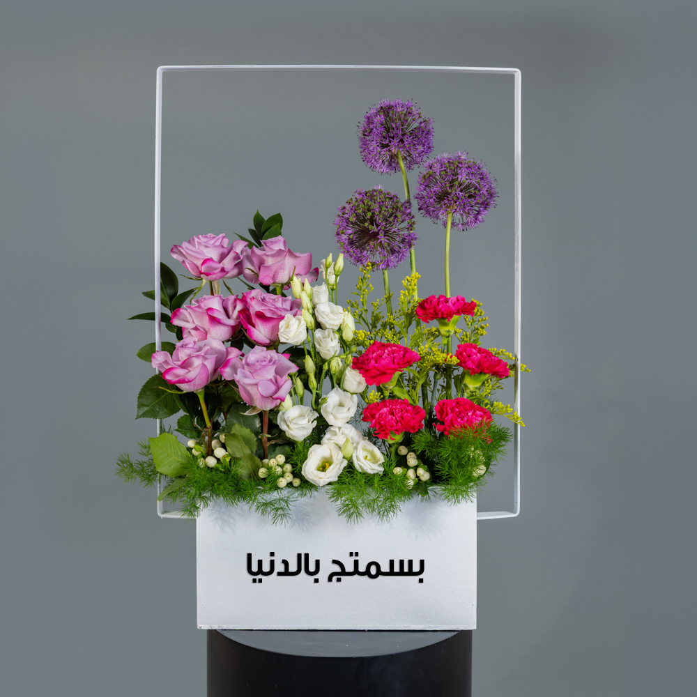 بوكس خشبي مع مقبض معدني يحتوي على أزهار الأليوم، الجوري، الكارنيشن والليسيانتوس.