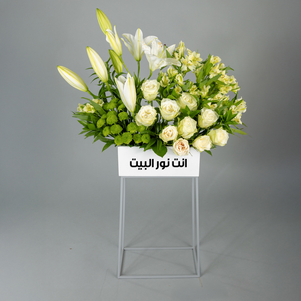 ستاند يحتوي على زهور الجوري، الليلي، الكريز والألستروميريا.
