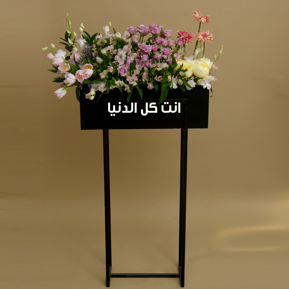 تنسيق ورد فاخر يجمع بين درجات البنك والبيج مع لمسة بنفسجية ناعمة، يضم جيربيرا، توليب، أوركيد، وجوري، مقدم في صندوق خشبي أسود مع ستاند حديد أنيق.