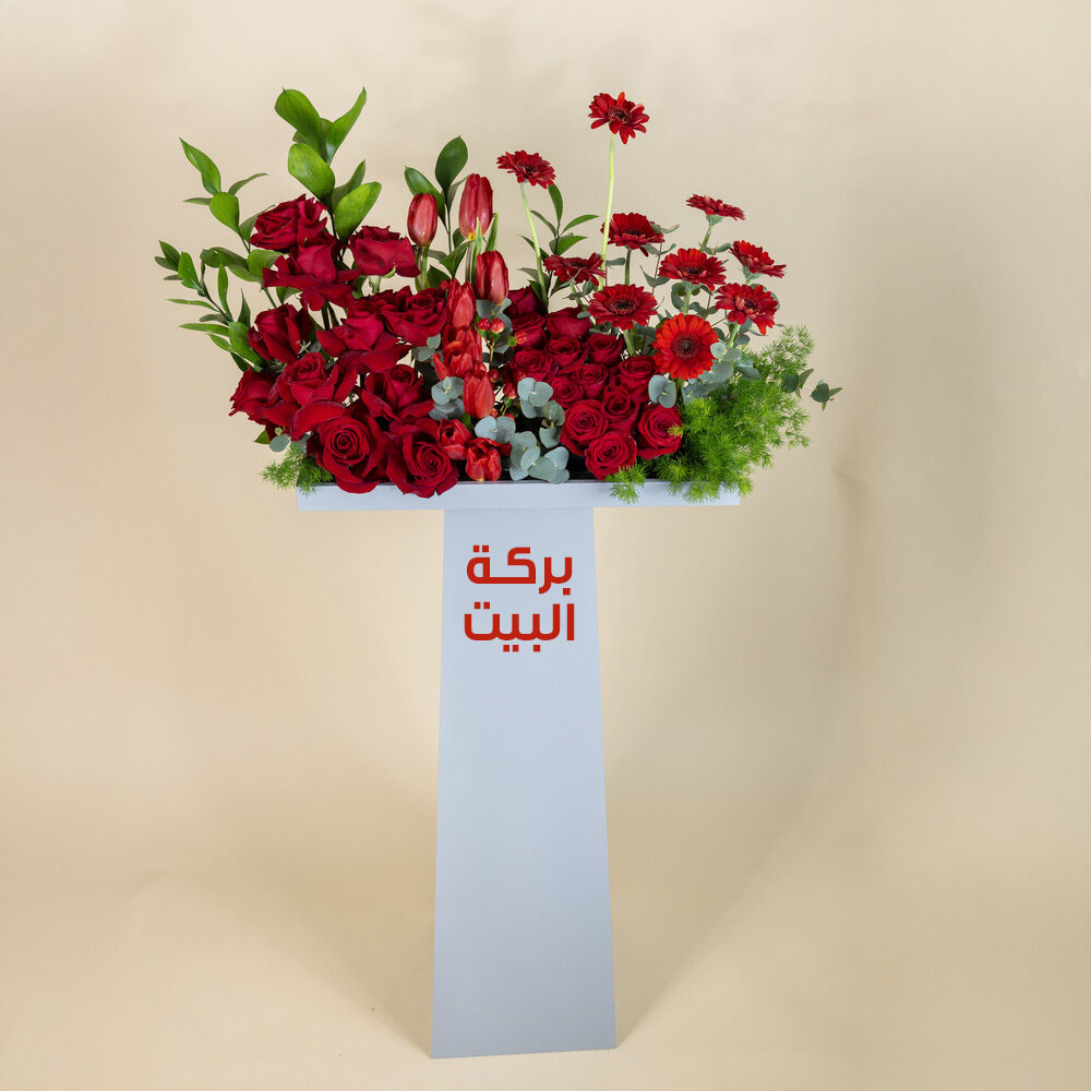 باقة تحتوي على زهور الجوري، التوليب والجيربيرا الحمراء مرتبة بشكل جميل في ستاند أبيض.