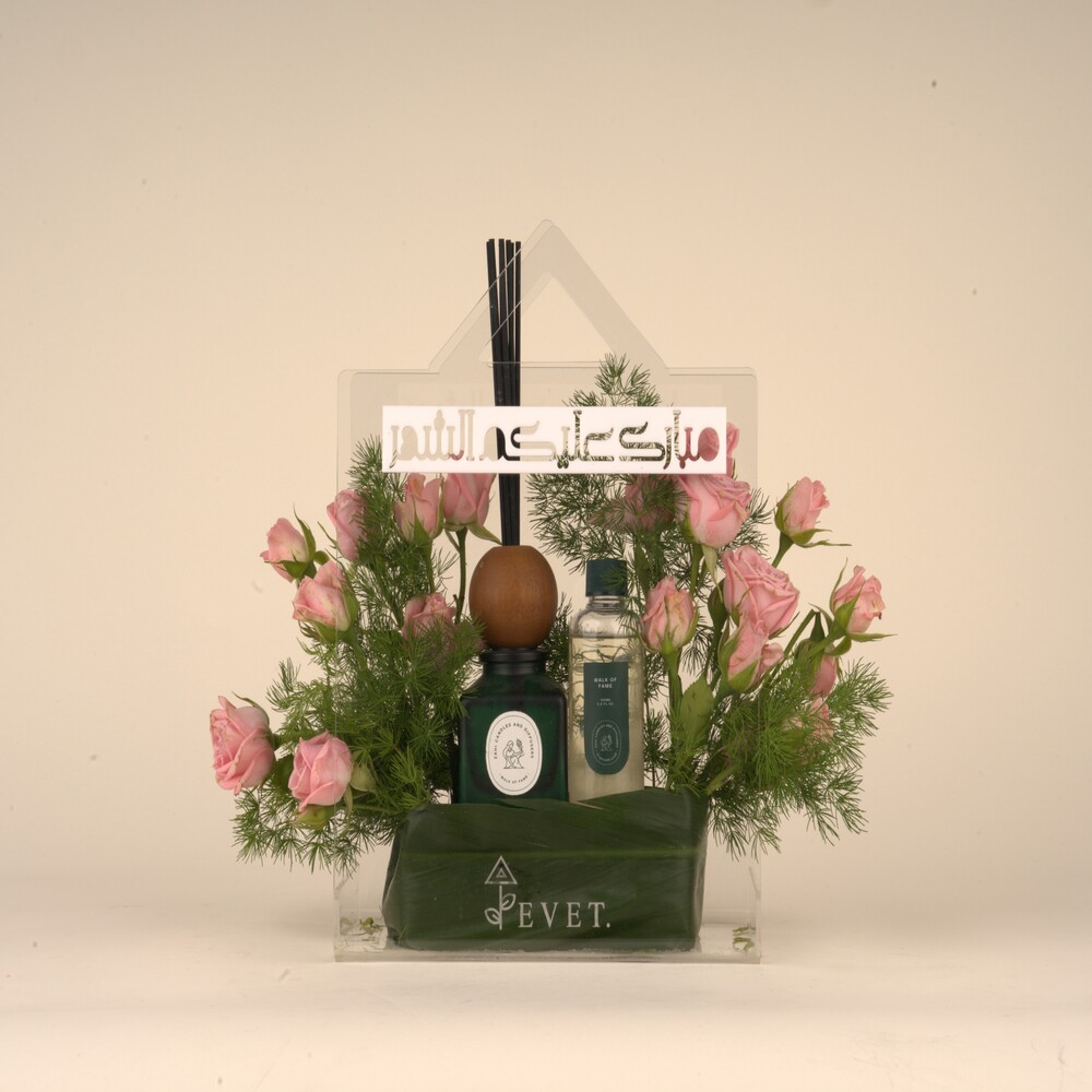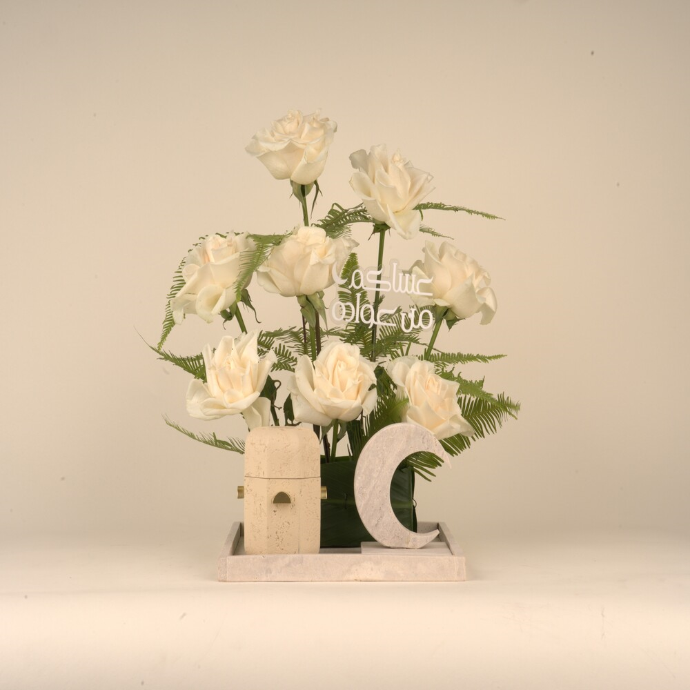 مزيج متألق من الجوري الأبيض والزينة الإحتفالية، يرمز إلى الفرح والتجدد. يأتي مع فواحة. تتوفر الفواحة باللون البيج أو الأبيض أو الأخضر.