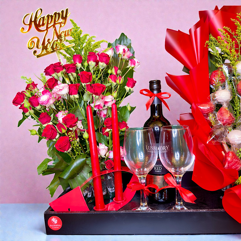 باقة من زهور البيبي جوري منسقة في صينية مع أعواد الشوكولاتة ومشروب خالي من الكحول مع أكواب.