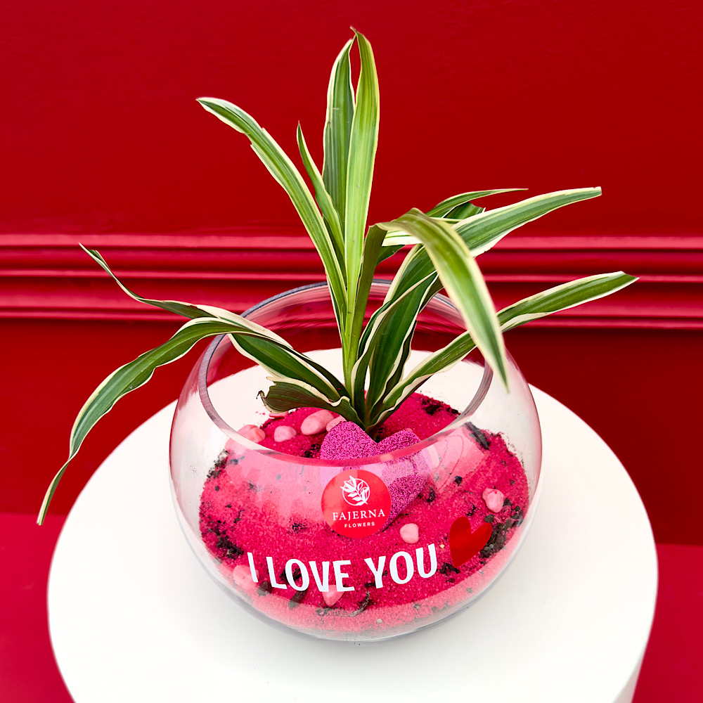 حديقة مصغرة تحتوي على نبات السبايدر بتصميم الحب، مرتب في فازة مستديرة.