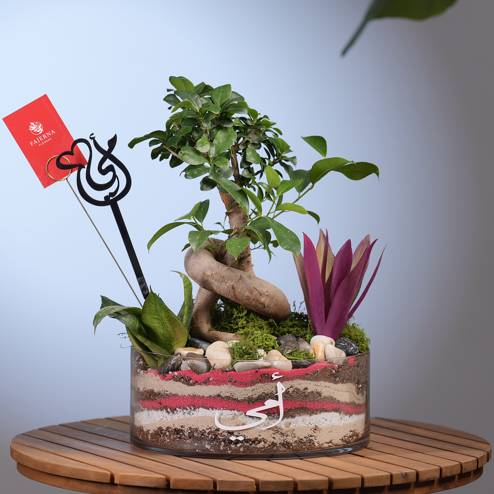 شجرة بونساي متوسطة الحجم فريدة من نوعها منسقة مع نباتات النيوريجيليا والسانسيفيريا بتصميم مميز كحديقة مصغرة مفتوحة.
