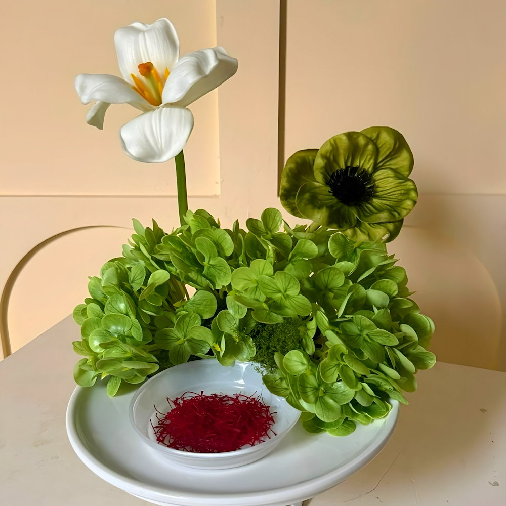 صينية تحتوي على زهور التوليب والهيدرانجيا، تأتي مع 2 جرام من الزعفران الفاخر. تنسيق عطري وأنيق، مثالي لإضفاء لمسة راقية على ترتيبات رمضان الخاصة بك.