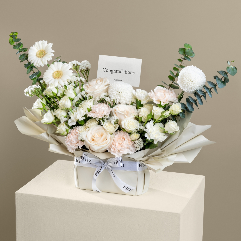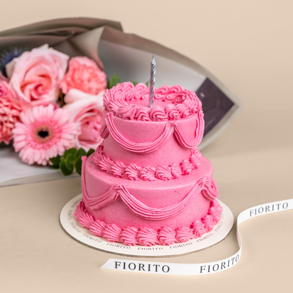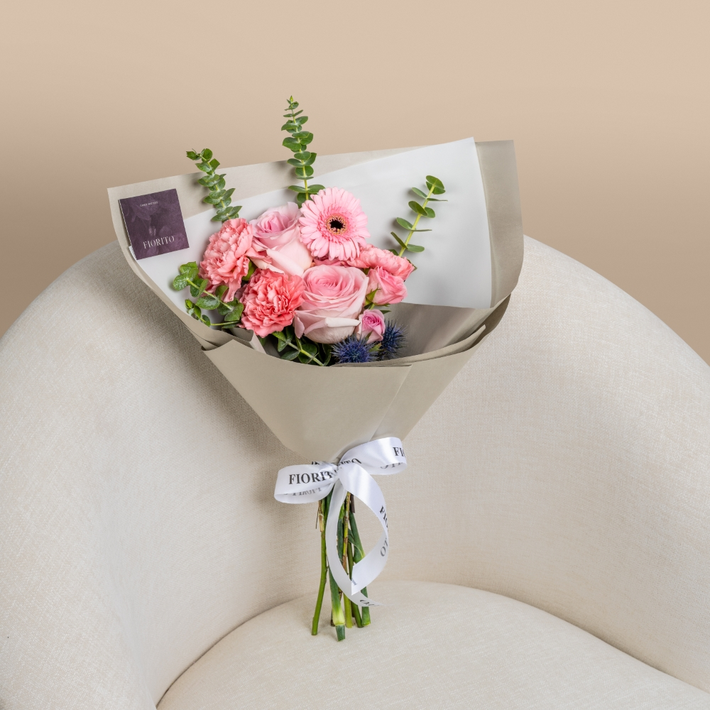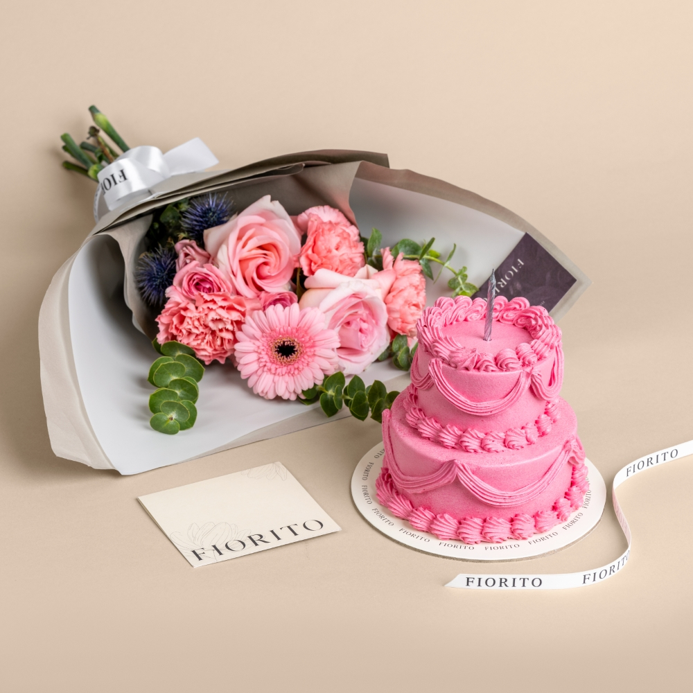 باقة يد راقية من زهور الجيربيرا، الكارنيشن، الجوري والبيبي جوري مع لمسات زهرية ناعمة، ومرفقة بكيكة ناعمة. هدية زهرية فاخرة مثالية للإحتفال بعيد ميلاد مميز.