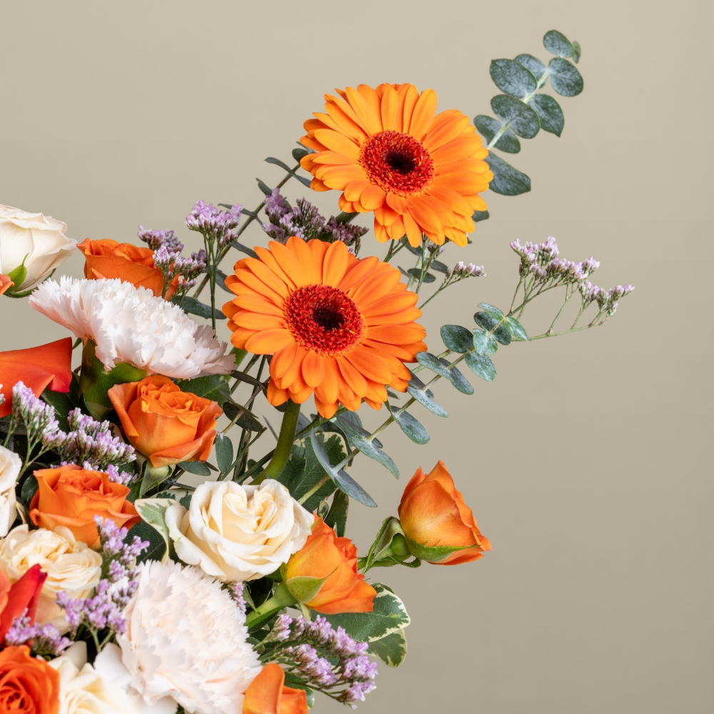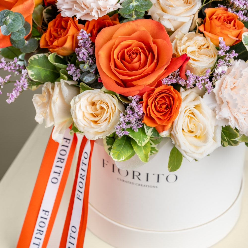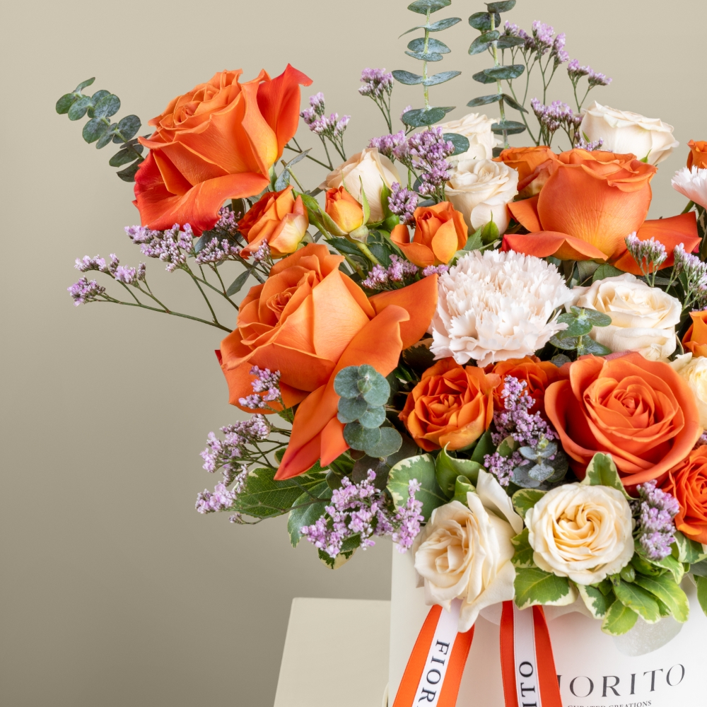 بوكس أنيق مليء بأزهار الجربيرا، الجوري، البيبي روز والكارنيشن بتصميم يعكس الفرح والجمال، وهو هدية مبهجة تضيف لمسة أنيقة لكل تهنئة أو مناسبة مميزة.
