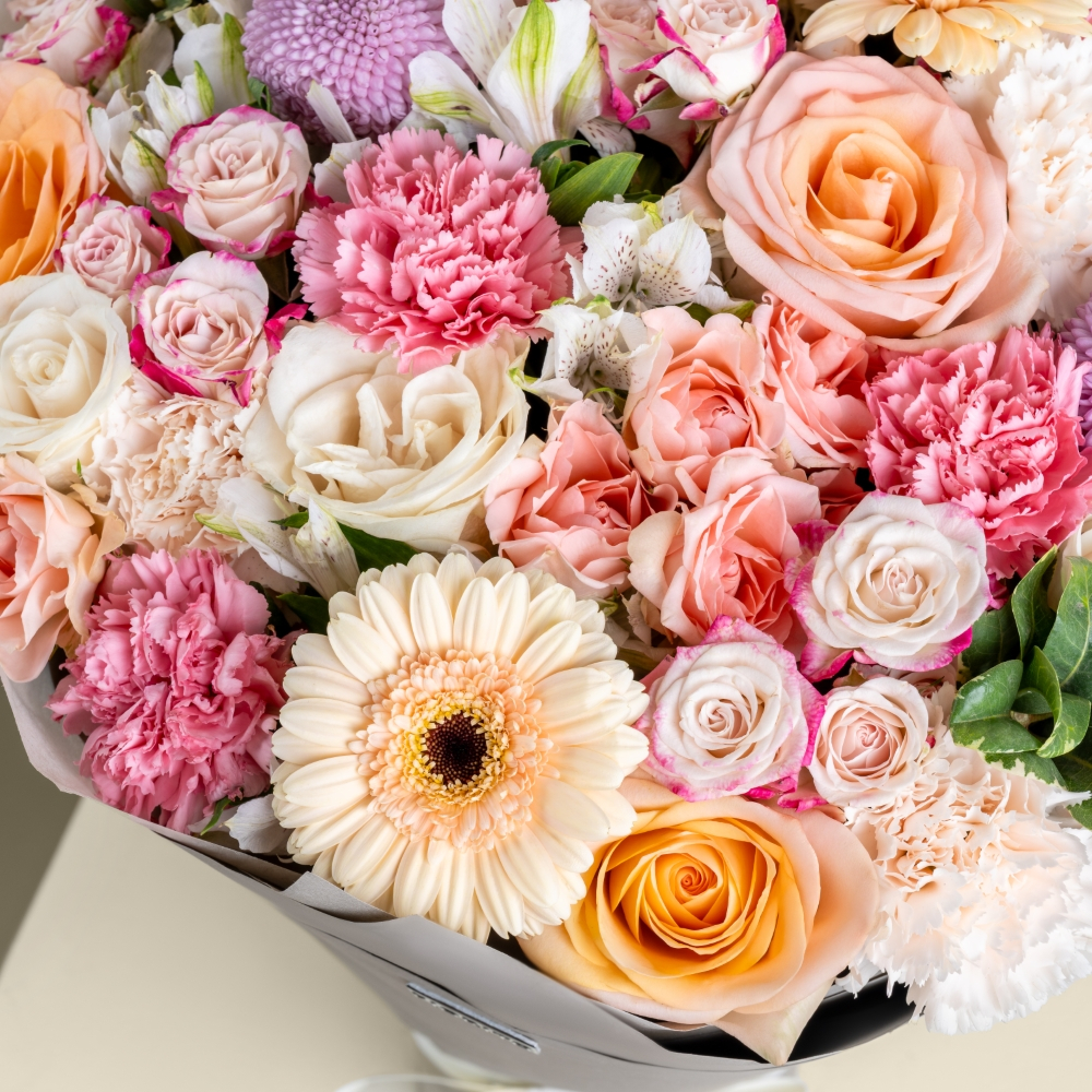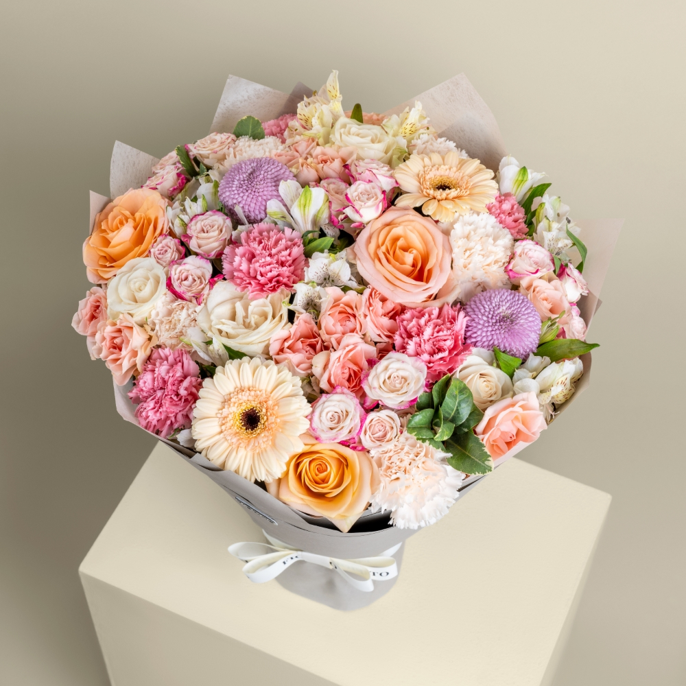 باقة يد تتميز بأزهار الجوري، الكارنيشن، الجربيرا والستروميريا بأسلوب ناعم وأنيق. هدية أنيقة مناسبة لأي مناسبة.