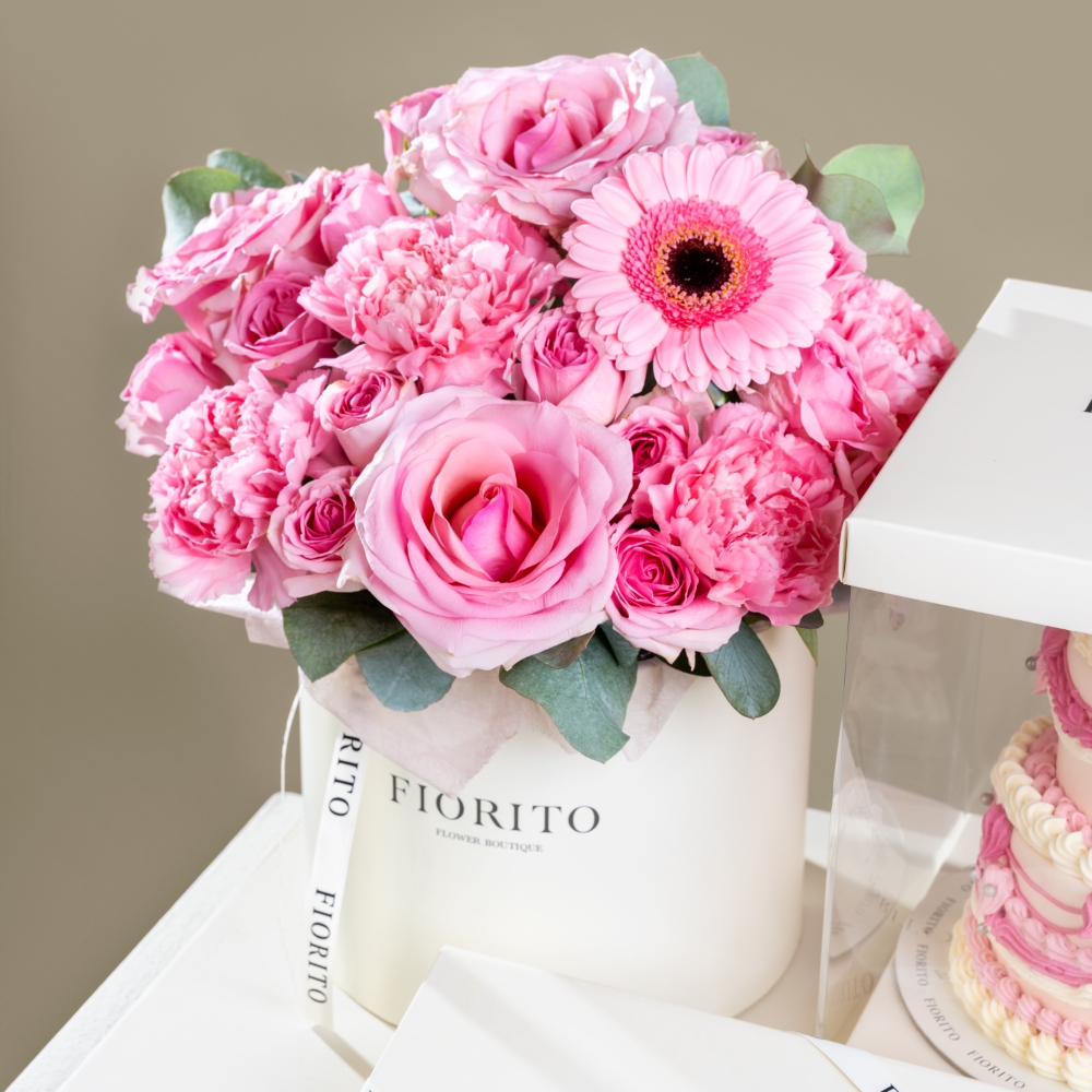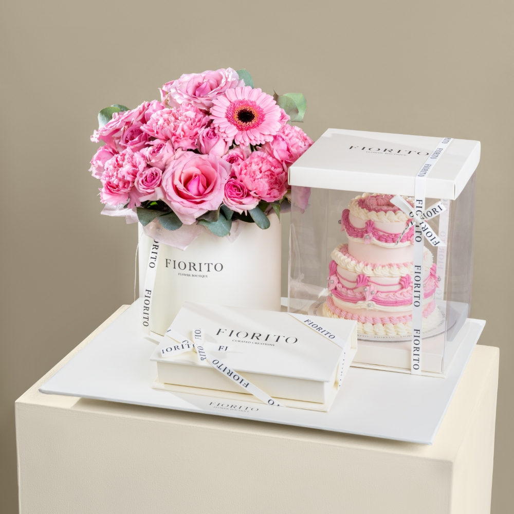 صينية مع علبة زهور من الجوري والجيربيرا والبيبي جوري والكارنيشن مع علبة من الشوكولاتة الفرنسية الفاخرة وكيكة لذيذة. هدية فاخرة مثالية للاحتفالات واللحظات السعيدة.
