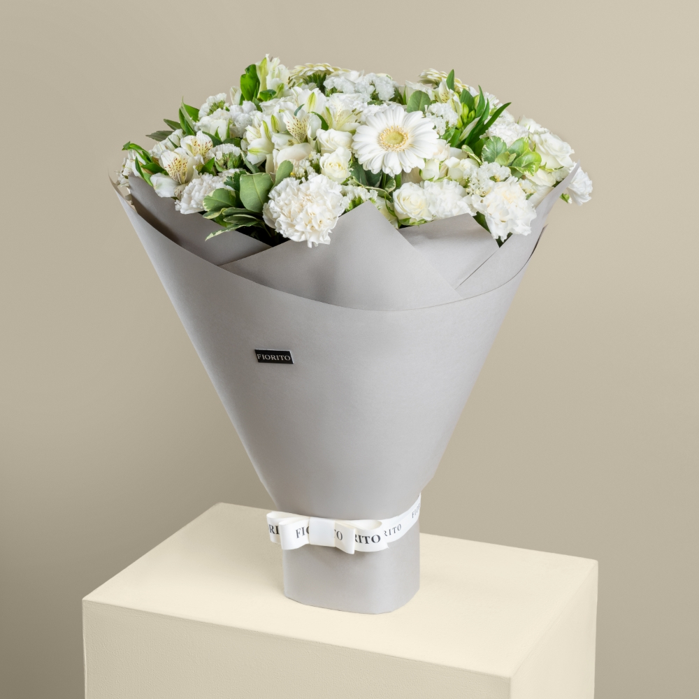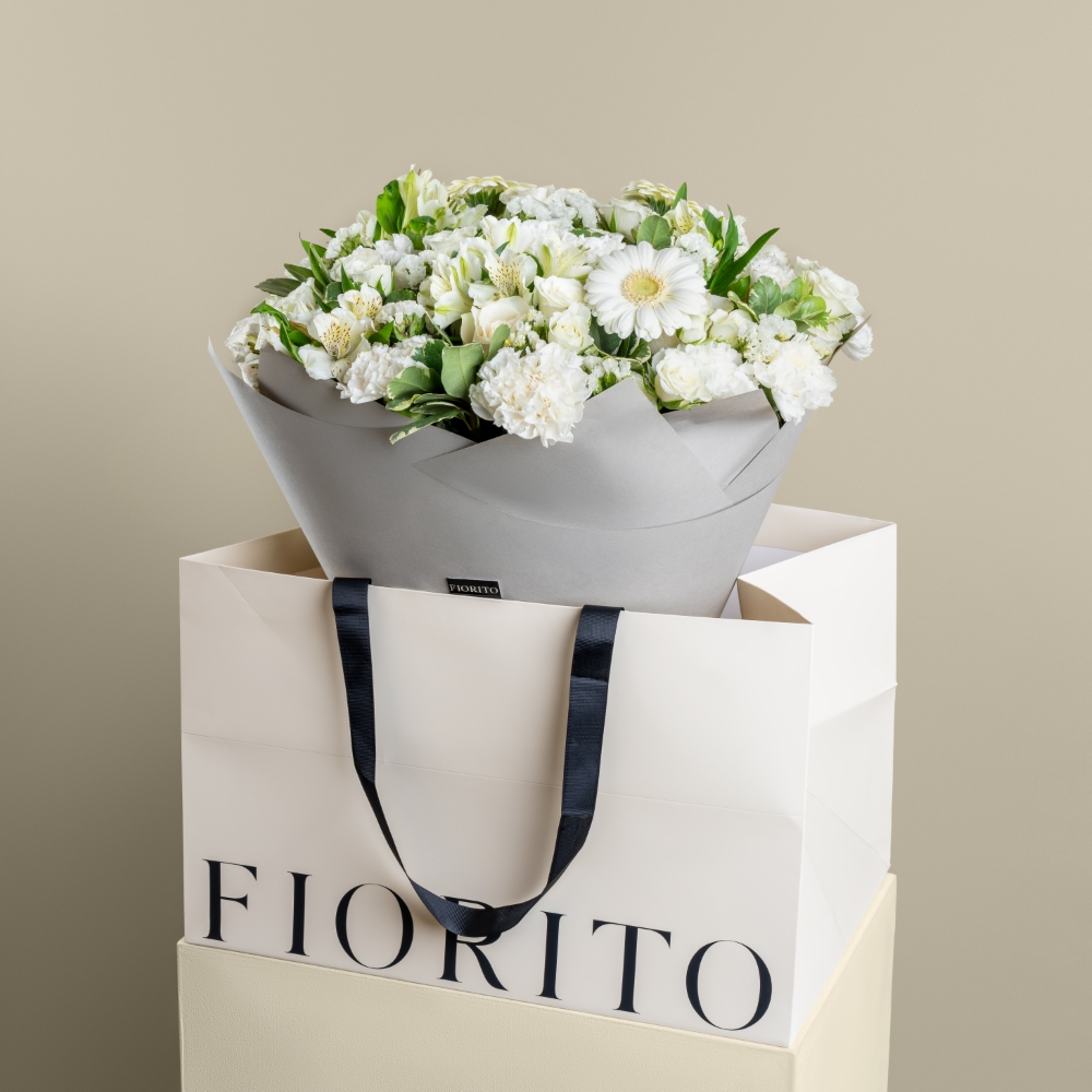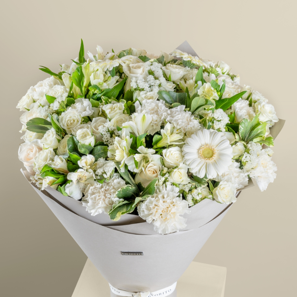 باقة يد ملئة بأزهار الستروميريا، الجوري، الجربيرا والكارنيشن بأسلوب أنيق وجميل. هدية رائعة تناسب الاحتفالات وأعياد الميلاد والمناسبات المؤثرة.