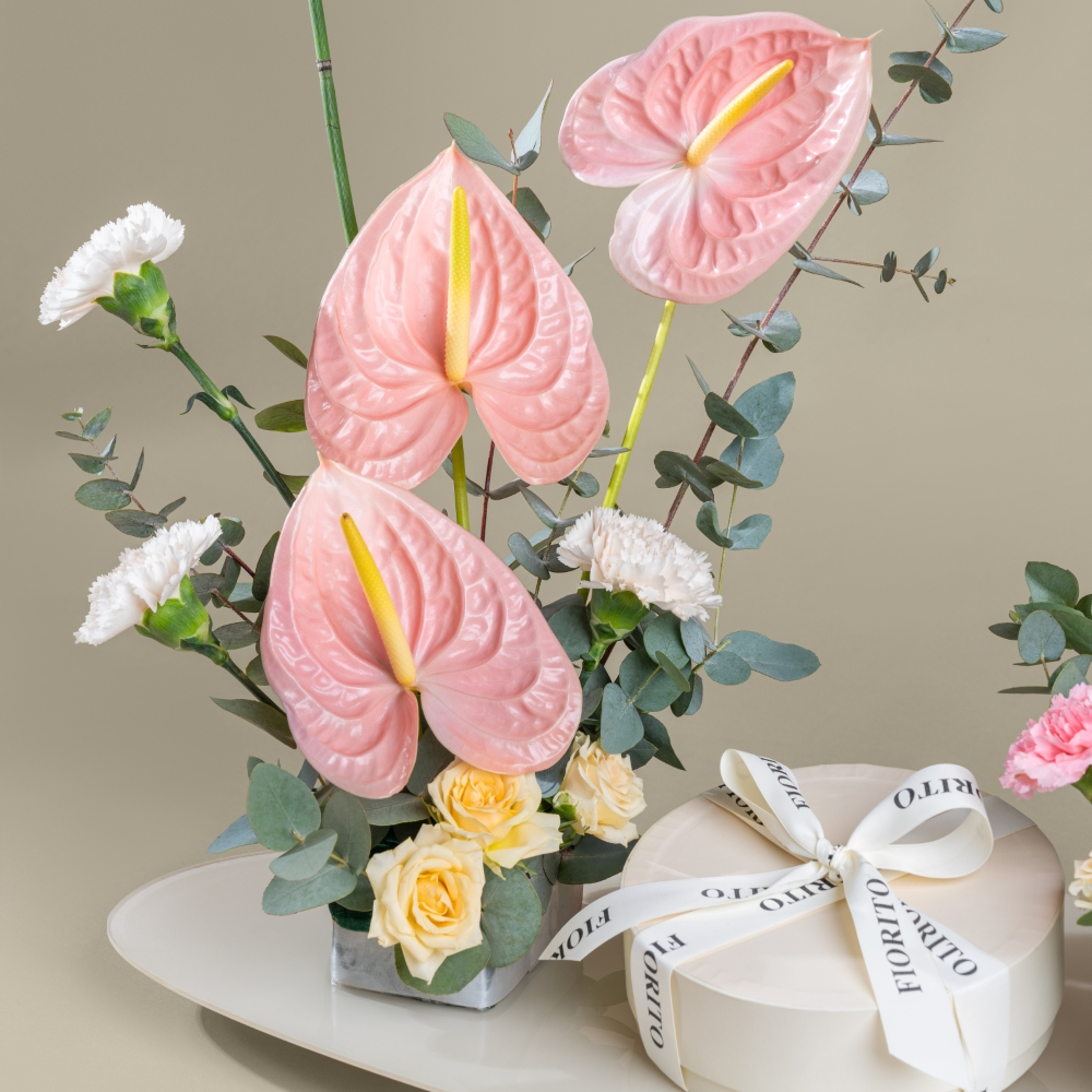 صينية تضم تشكيلة فريدة من زهور الجوري، الجيربيرا، الكارنيشن، والأنثوريوم مع صندوق من الشوكولاتة الفرنسية. تنسيق عصري وأنيق مصمم ليضفي لمسة من الفخامة الإستثنائية على إحتفالاتكم.