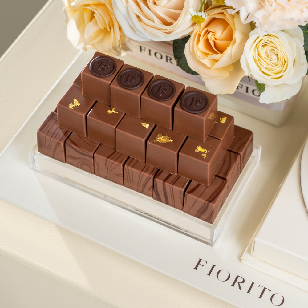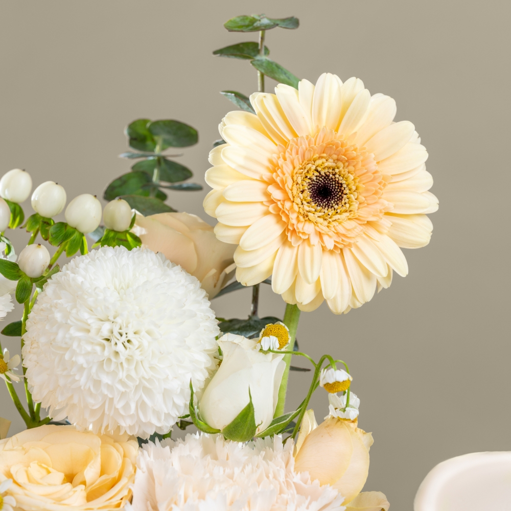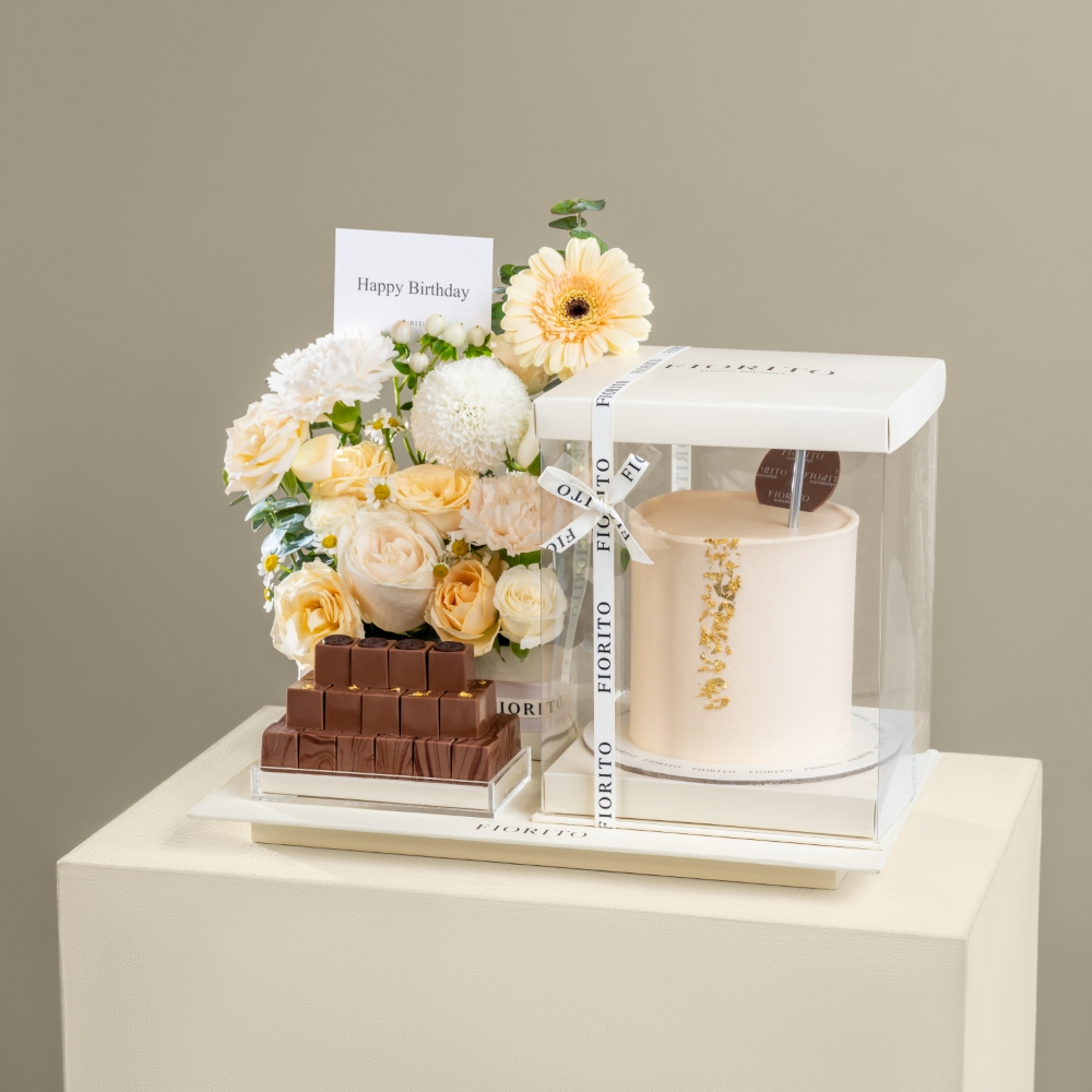 صينية راقية تضم زهور الجوري، البنغ بونغ، الجيربيرا، الكارنيشن والبيبي جوري مع شوكولاتة فرنسية فاخرة وكيكة رقيقة. هدية أنيقة تناسب أي مناسبة عزيزة.