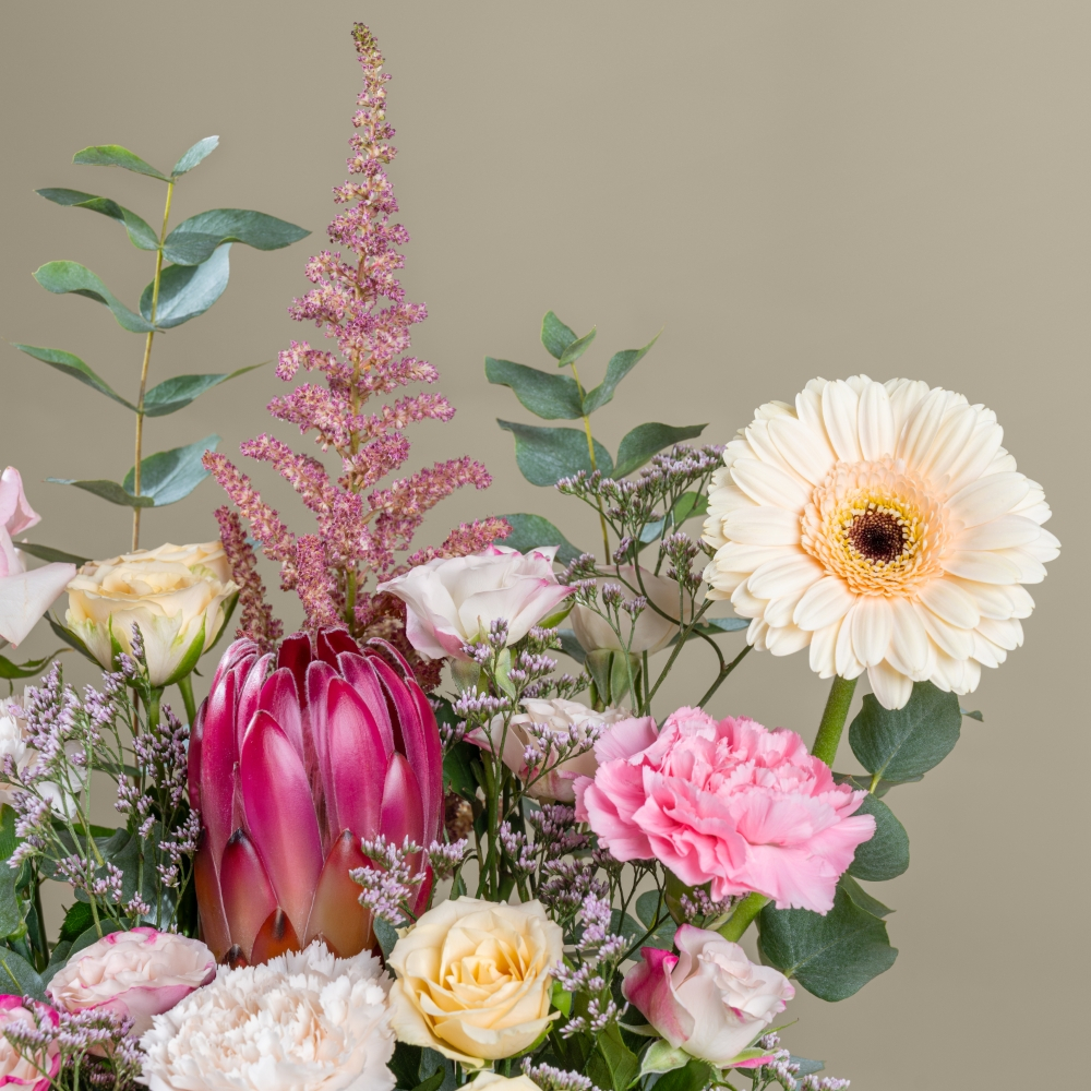 صندوق يجمع مزيجاً فاخراً من زهور الجوري، البيبي جوري، الجيربيرا، الكارنيشن، والبروتيا إلى جانب صندوق من الشوكولاتة الفرنسية. مزيج راقي من الزهور القوية والحلويات الفاخرة مصمم لتدليلها في يوم الأم.