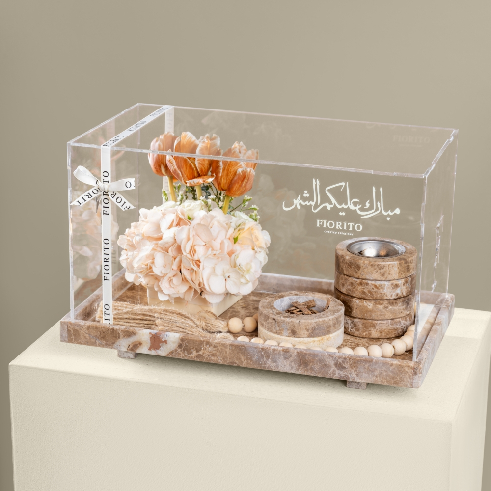 بوكس مليئ بنباتات الأوركيد وطحلب النخيل. الهدية المثالية للإحتفال بالإنجازات بكل أناقة.