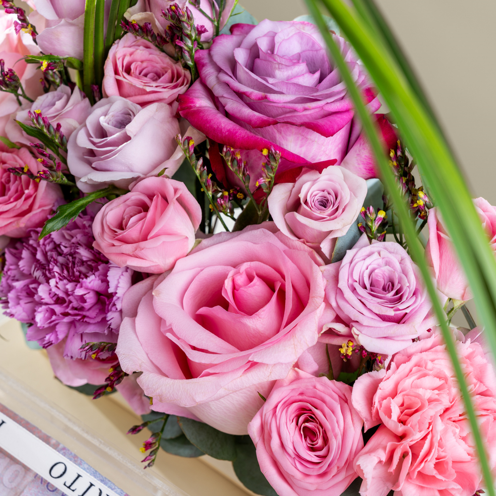 صينية مزينة بالجوري، البيبي جوري والكارنيشن مع صندوق أكريليك أنيق مخصص لتقديم النقود. هدية جميلة تناسب الاحتفالات والمناسبات المبهجة. ملاحظة: الباقة لا تشمل النقود.