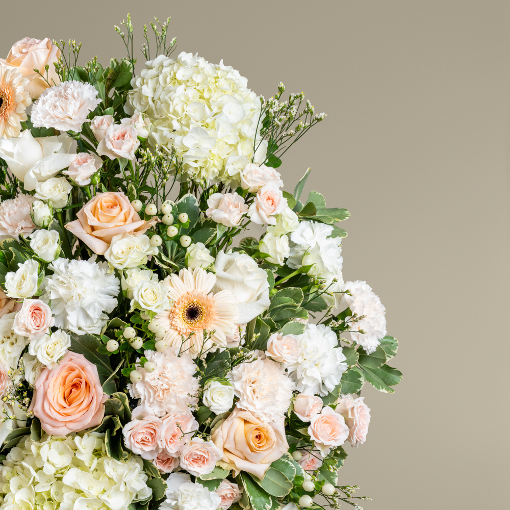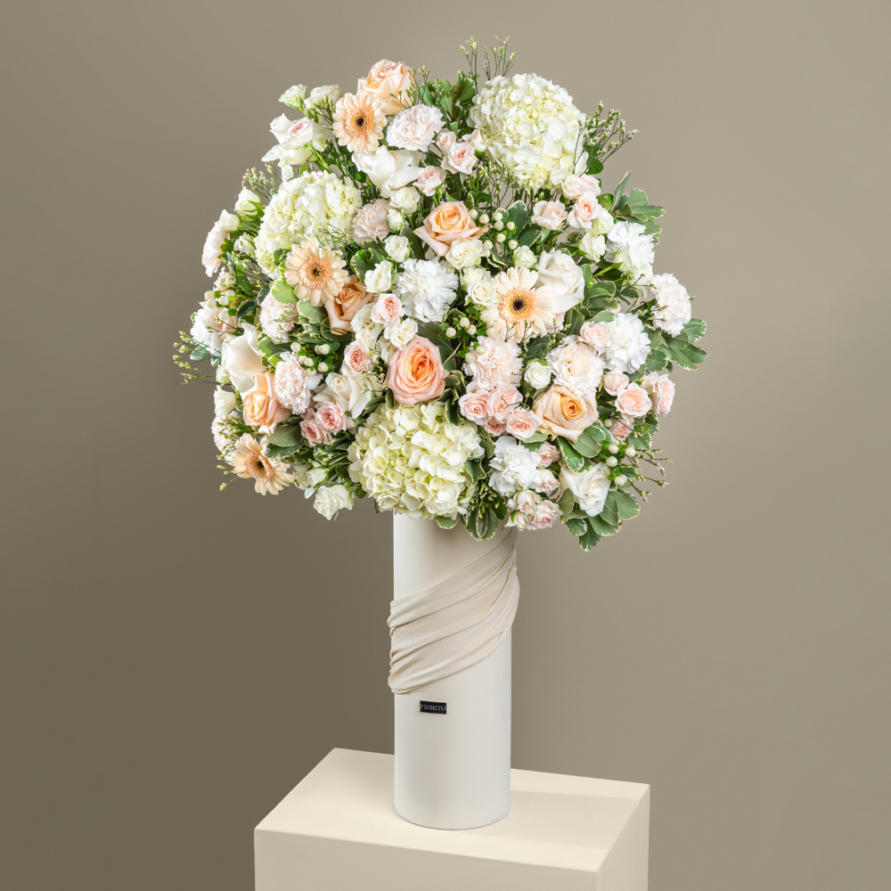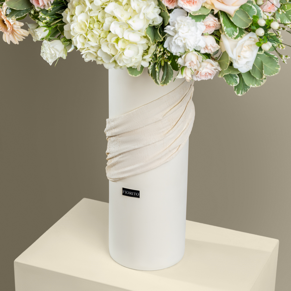 فازة أنيقة مليئة بأزهار الهايدرنجا، الجربيرا، الكارنيشن، الجوري والهايبركم بتفاصيل أنيقة تمنحها إطلالة راقية، وهي خيار فاخر للحظات المؤثرة والاحتفالات والهدايا المميزة.