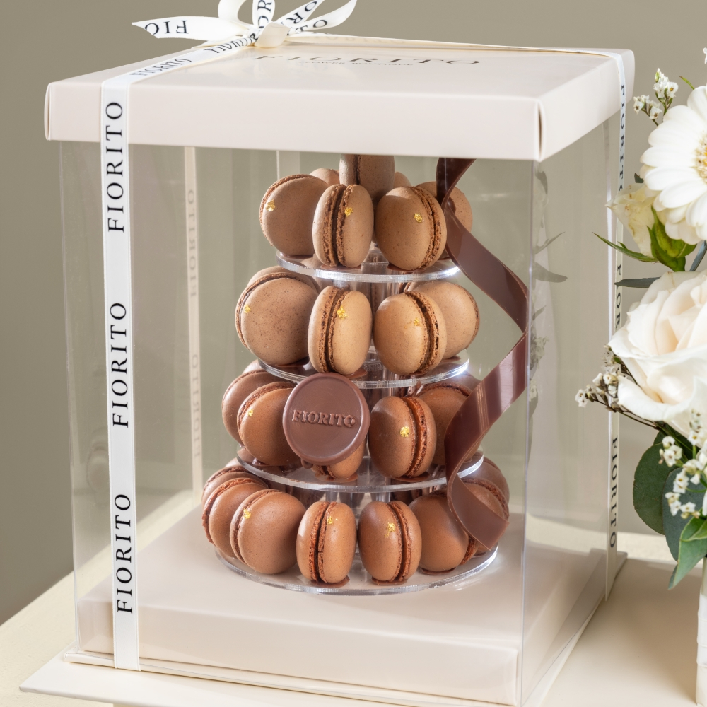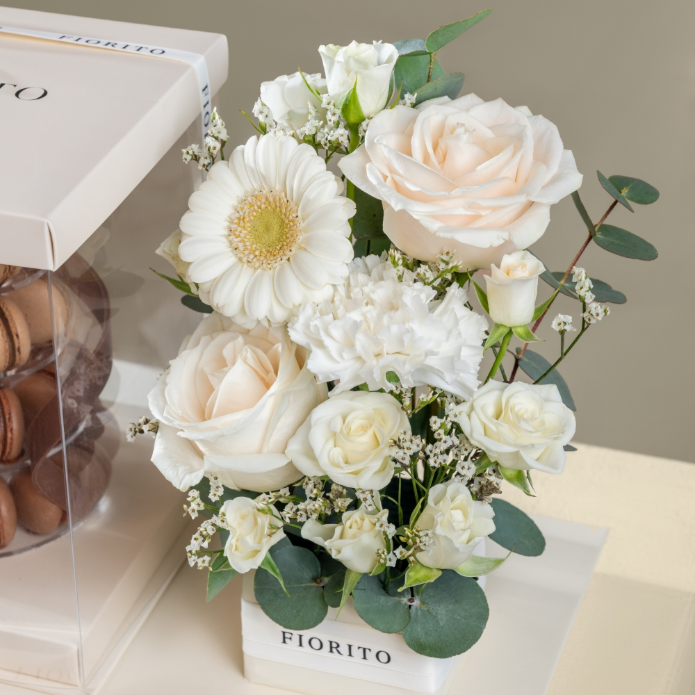 صينية مرتبة بزهور الهايبريكم، الجيربيرا، الكارنيشن، البيبي جوري والجوري مع ماكارون الشوكولاتة اللذيذ لتجربة مزهرة فاخرة. هدية راقية مصممة لتضفي لمسة من السحر والرقي على أي مناسبة.