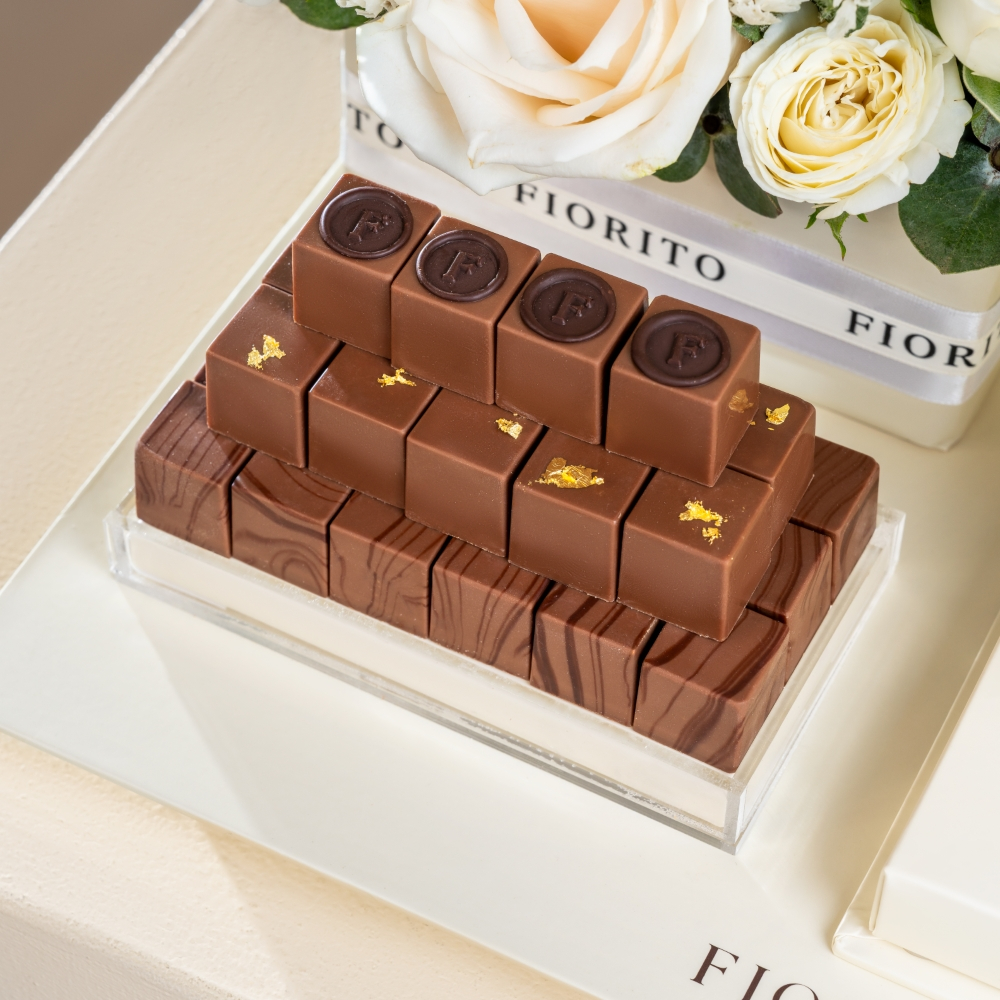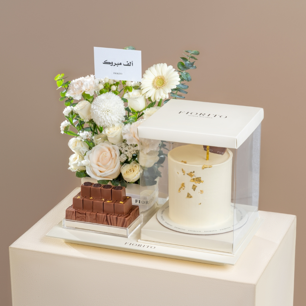صينية راقية تضم زهور الجوري، البنغ بونغ، الجيربيرا، الكارنيشن والبيبي جوري مع شوكولاتة فرنسية فاخرة وكيكة رقيقة. هدية أنيقة تناسب أي مناسبة عزيزة.