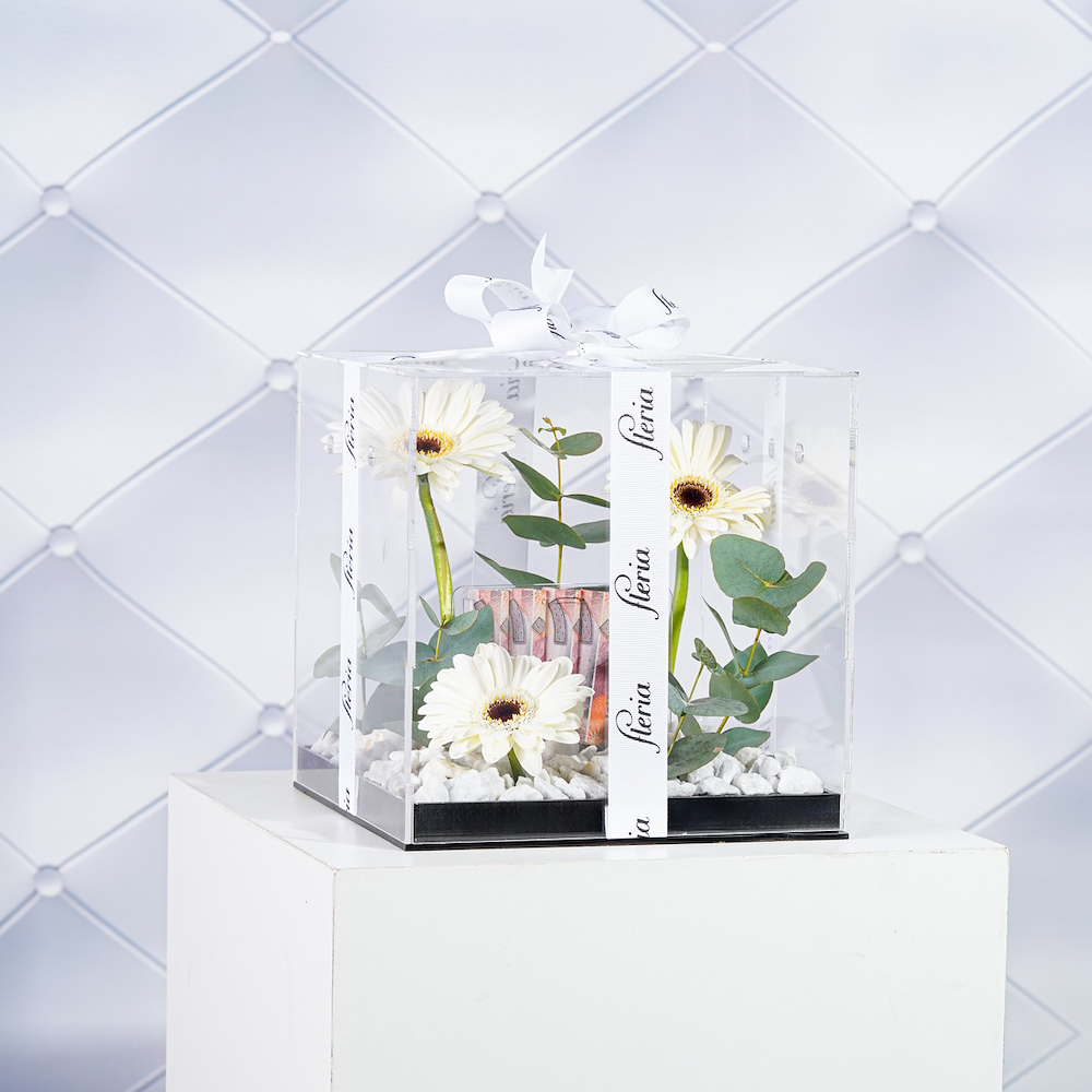 باقة تحتوي على أزهار البيبي جوري مع الشوكولاتة البلجيكية والاسم المخصص.