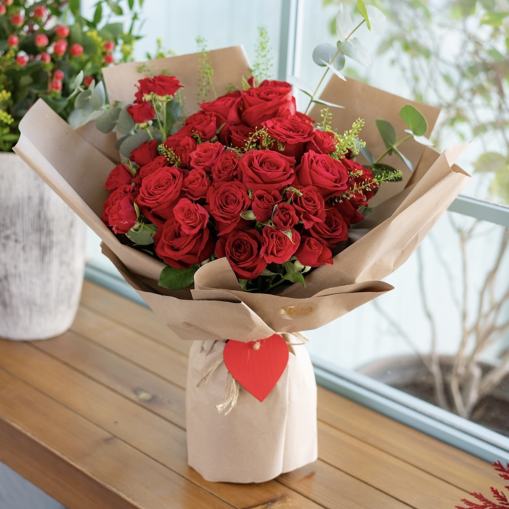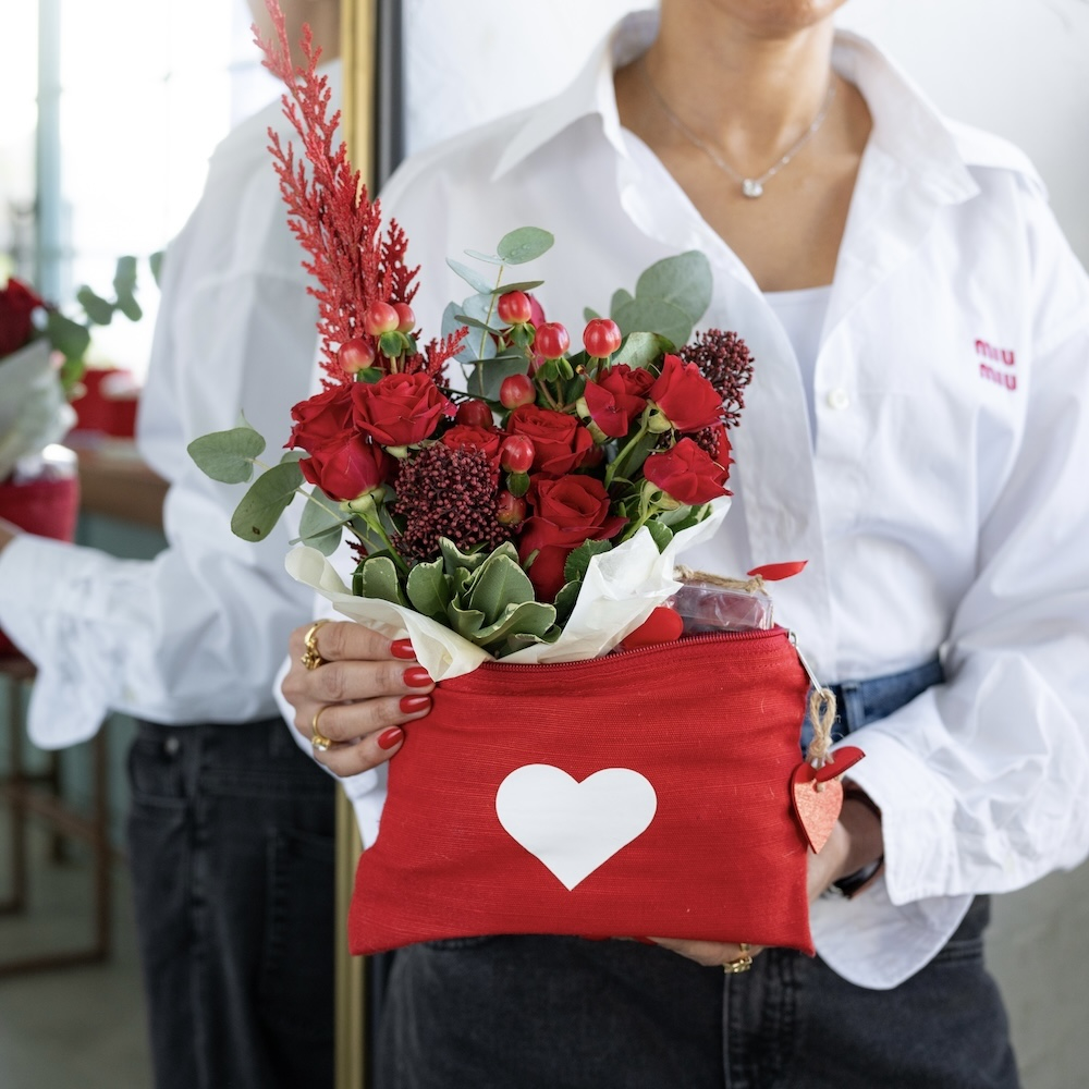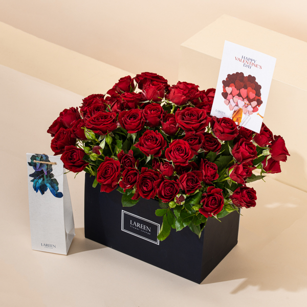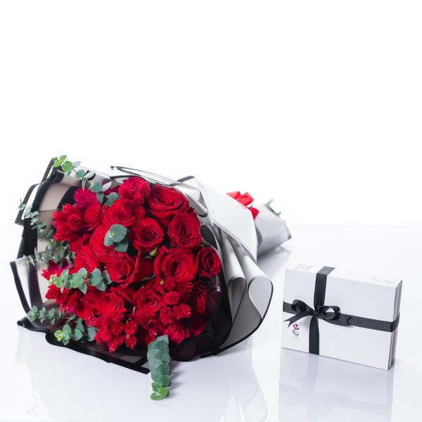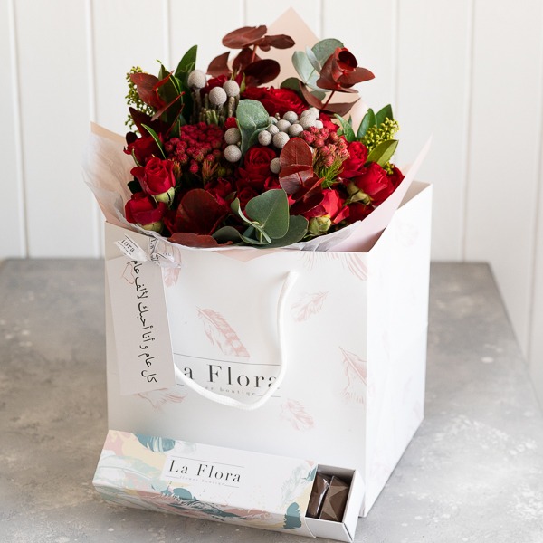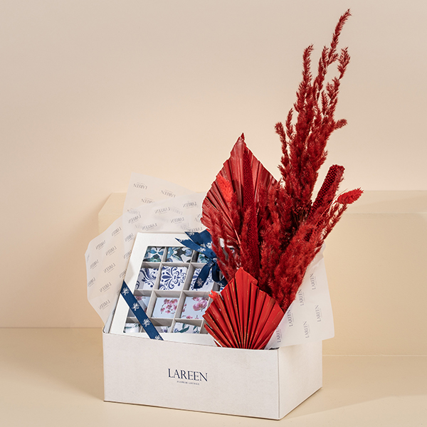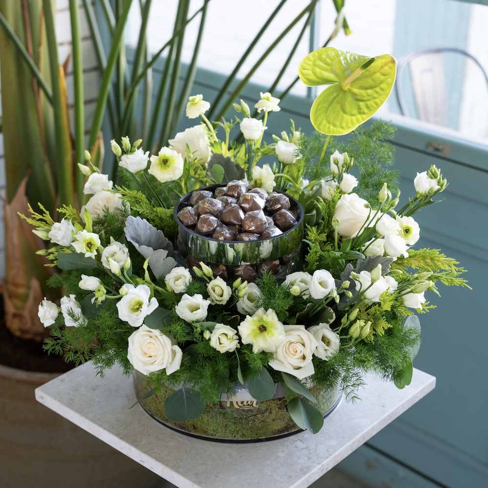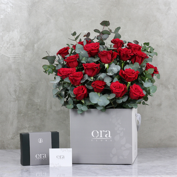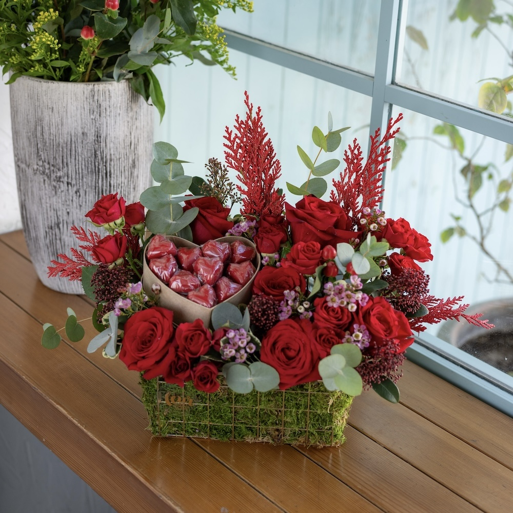 سلة تحتوي على الزهور و الشوكولاتة البلجيكية على قلب الحب.
