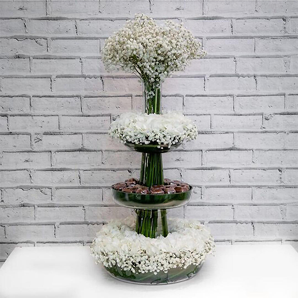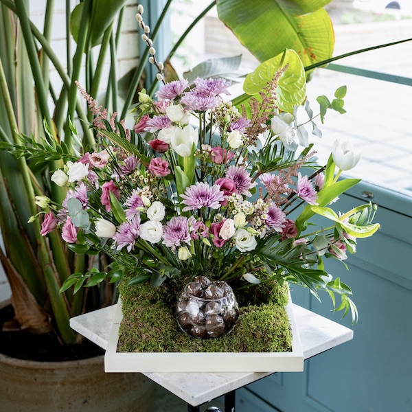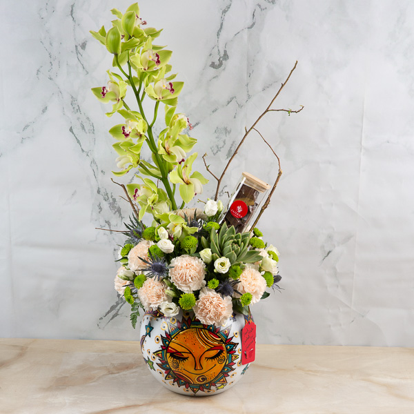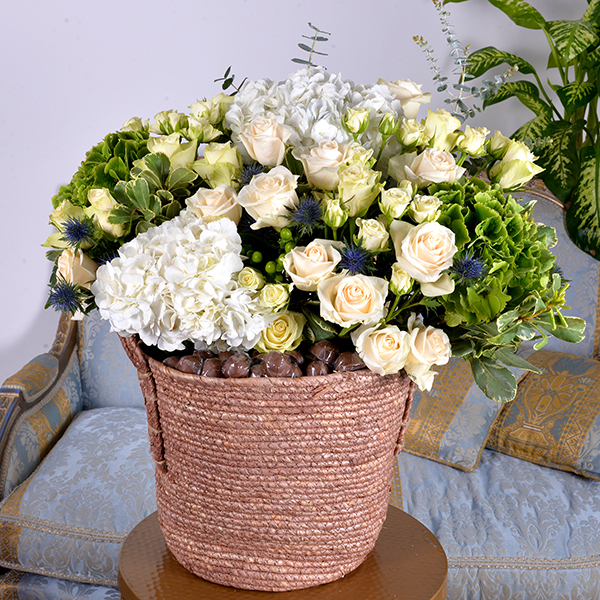 زهور الجوري، الإستوما والأنثوريوم مرتبة بشكل جميل في فازة زجاجية مع 500 جرام من الشوكولاتة البلجيكية.