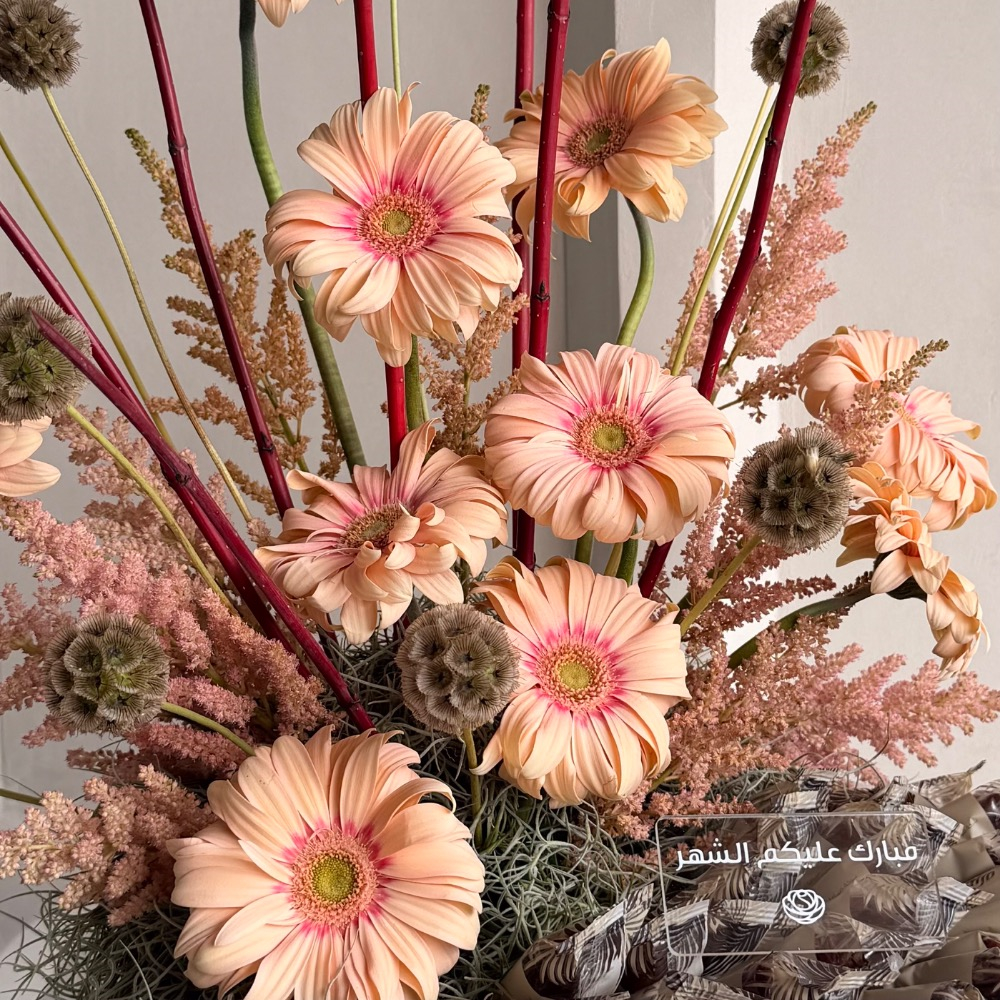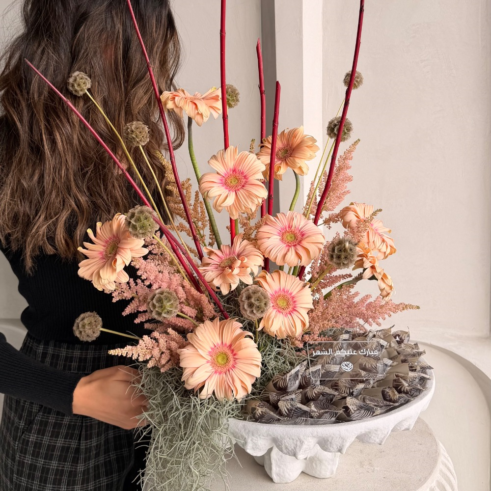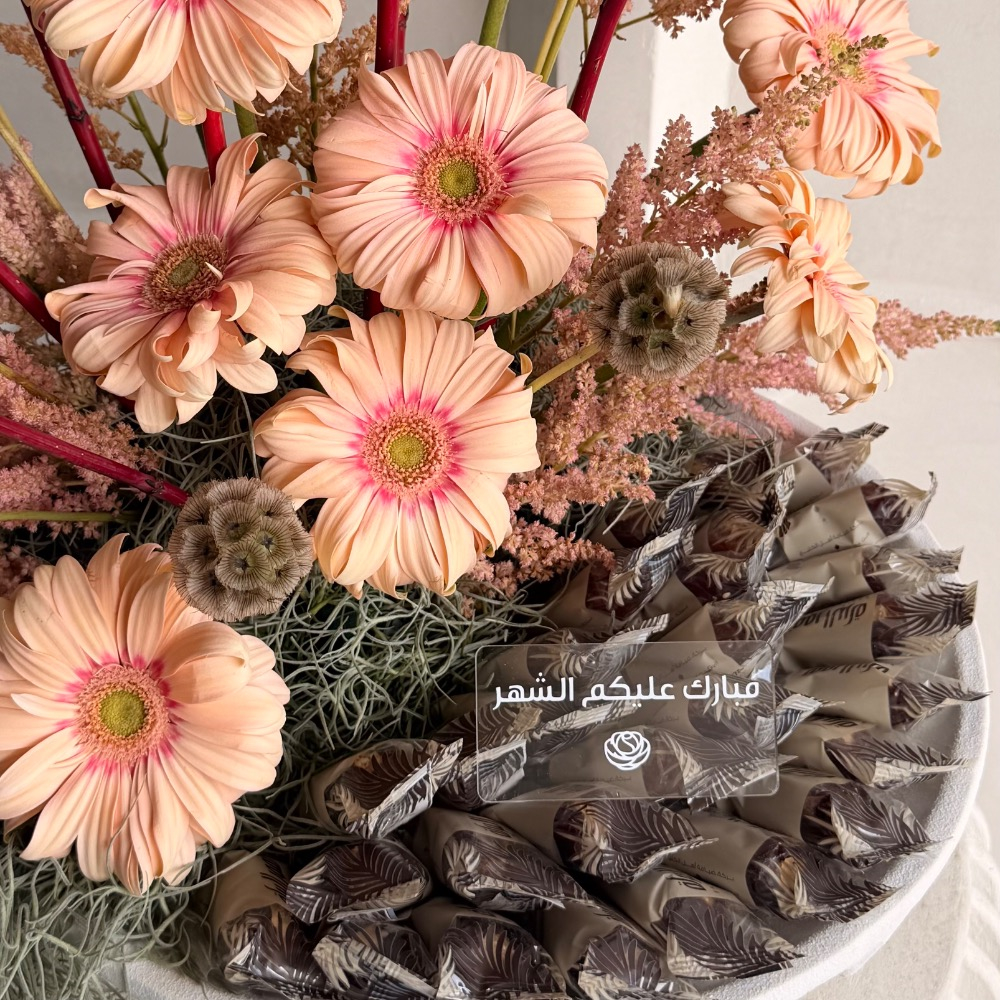 ستاند من السيراميك مزخرف باللون الأبيض مزين بزهور الجيربيرا والتمر المحشي بالرهش والسمسم.