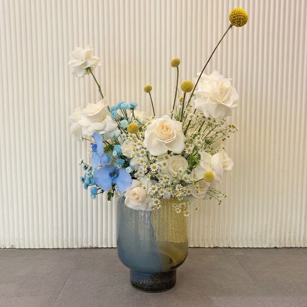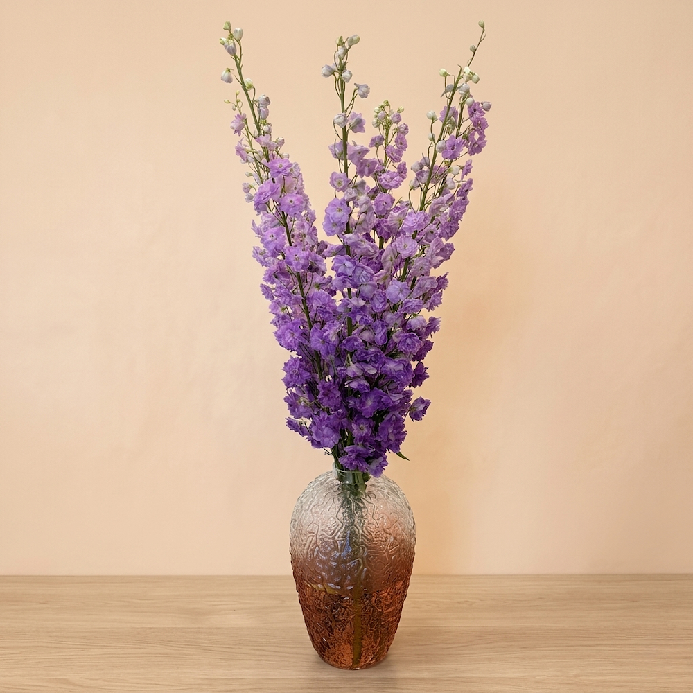 فازة زجاجية شفافة، منقوشة بأنماط هندسية، ممتلئة بباقة من زهور الدلفينيوم ذات تدرجات لونية ساحرة من البنفسجي والأرجواني.
