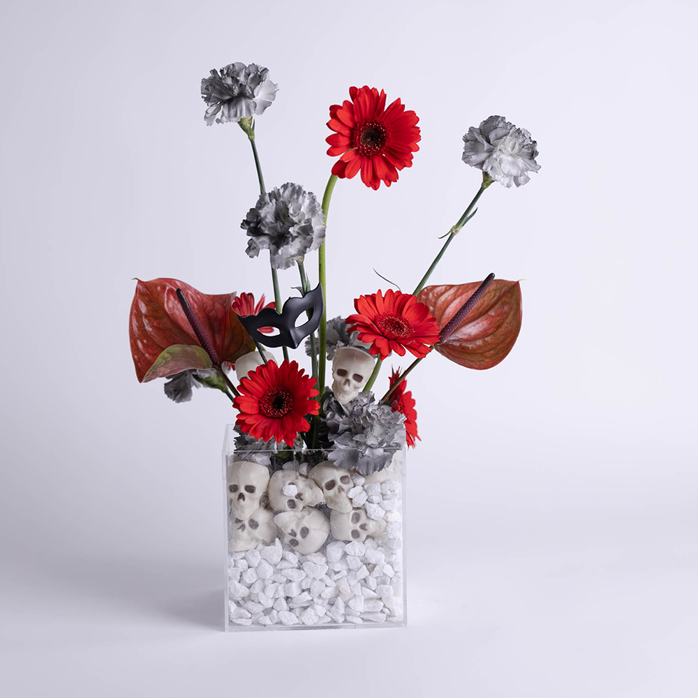 تنسيق ورد جريء بطابع غامض يجمع بين الجربيرا الحمراء والقرنفل الرمادي مع إضافات فنية مثل الجمجمات والقناع الأسود داخل وعاء زجاجي مليء بالأحجار البيضاء، تصميم يعكس روح الهالوين والأجواء الدرامية بأسلوب أنيق ومميز، مثالي للاحتفالات والمناسبات ذات الطابع الخاص.