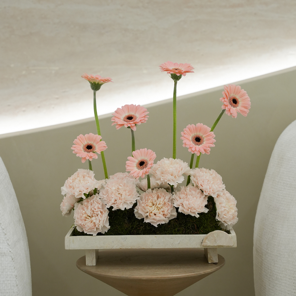 تنسيق زهور ناعم وأنيق بدرجات الأبيض والوردي، يعبر عن النقاء والفرح، مزين بعبارة الحمدلله على السلامة ليكون هدية مثالية لإستقبال الأحباب بلمسة راقية ومليئة بالمشاعر الجميلة. تحتوي الباقة على زهور السمبيديوم والكارنيشن.