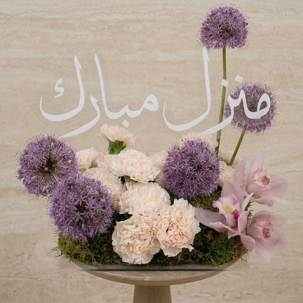 تنسيق زهري أنيق مصمم خصيصاً لمناسبات السكن الجديد، يجمع بين نعومة زهور الكارنيشن الوردية وفخامة الأوركيد، مع لمسة عصرية من زهور الأليوم البنفسجية. يتوسط التنسيق عبارة "منزل مبارك" مكتوبة بخط عربي انسيابي على أكريليك شفاف، مما يجعله قطعة ديكور مثالية تضفي بهجة ورقياً على المكان.