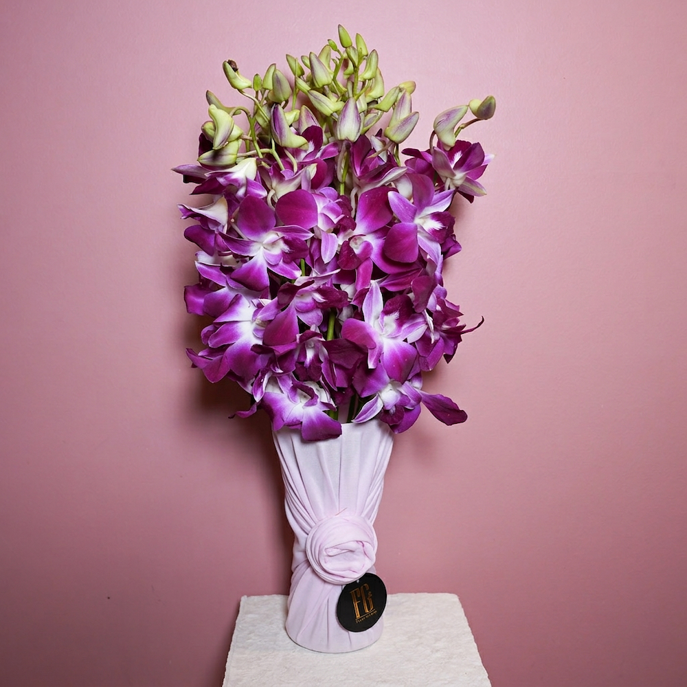 باقة من زهور الأوركيد الفاخرة باللون البنفسجي والأبيض، مرتبة بأناقة في فازة ملفوفة بقماش ناعم، لتعكس لمسة راقية وجمال طبيعي.