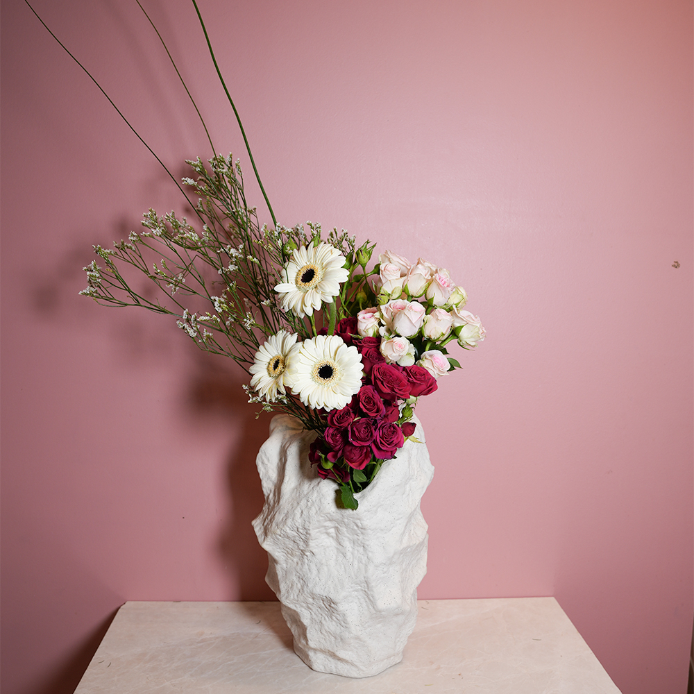 تنسيق زهري فاخر يجمع بين الأناقة والجمال الطبيعي يحتوي على جوري وجربيرا مع لمسات من الزهور البرية مقدم في فازة بتصميم حجري منحوت يضيف لمسة فنية عصرية.
