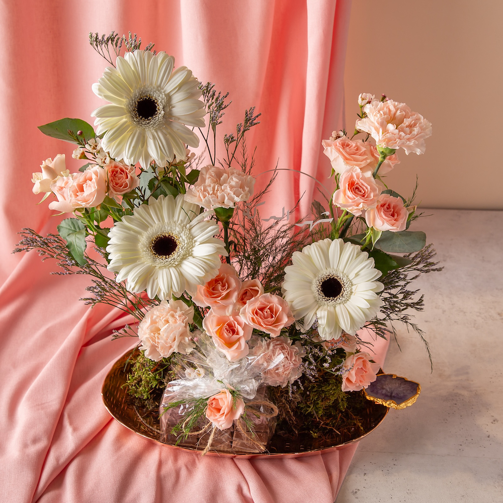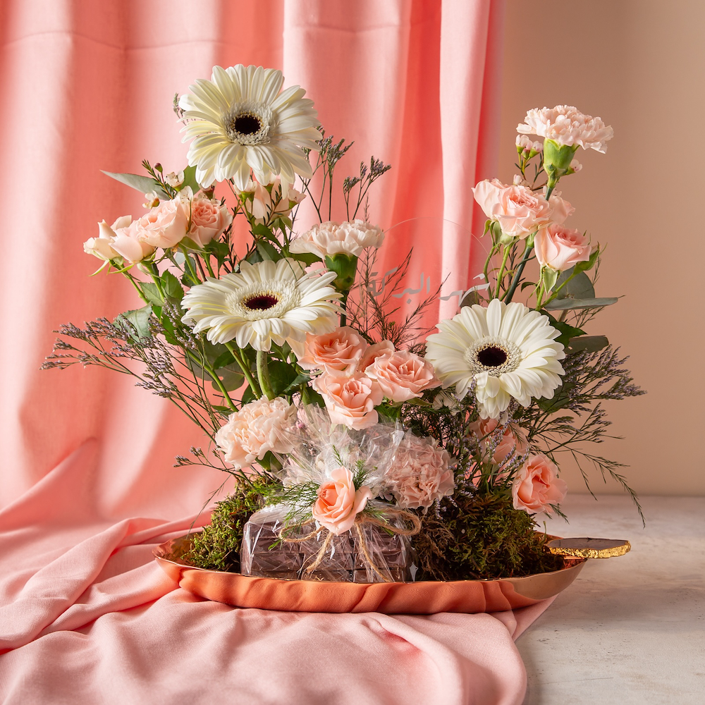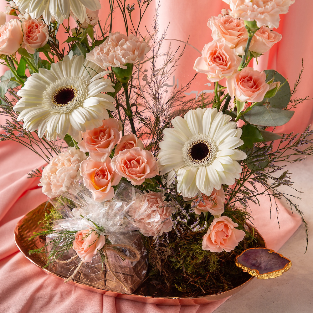 صينية فاخرة بمسكة رخامية تحتوي على مجموعة من ازهار الجيربيرا، الكارنيشن والبيبي روز مع شوكولاتة بلجيكية.