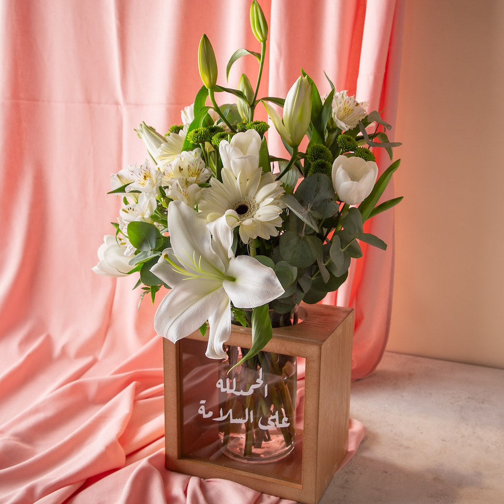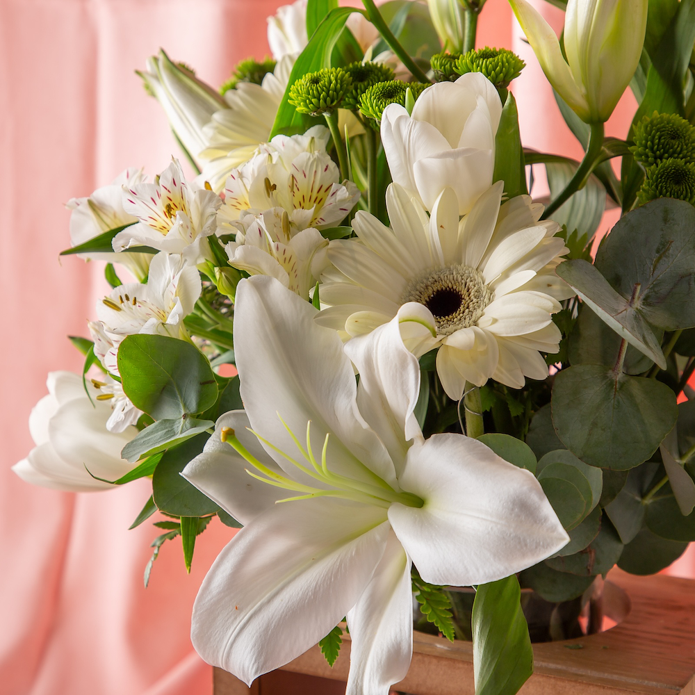 هذه الباقة تحتوي على مجموعة من ازهار الكازابلانكا، التوليب، الالسترومريا والجيربيرا.