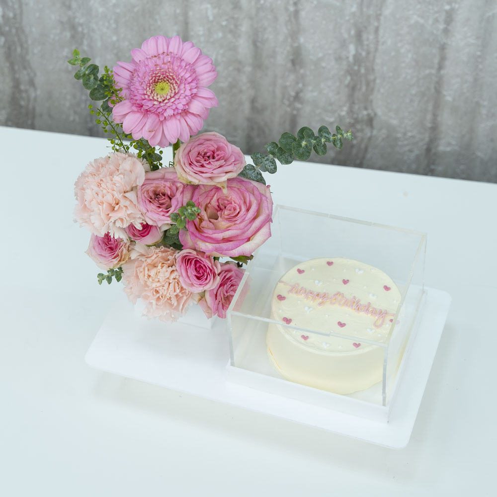 هذه الباقة تحتوي على زهور الجوري، الجيربيرا والبيبي جوري مع كيكة بينتو الشوكولاتة.