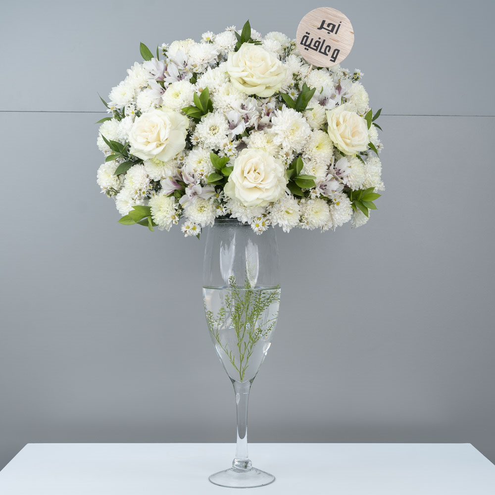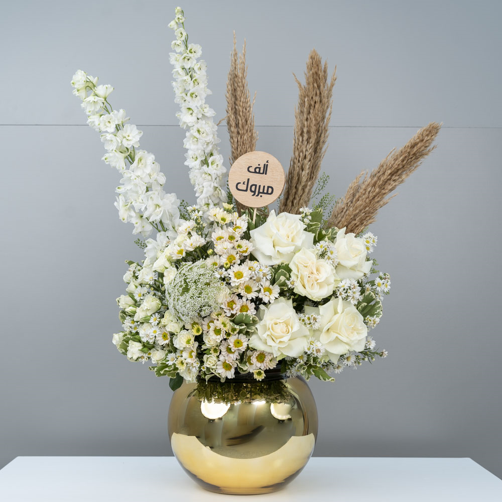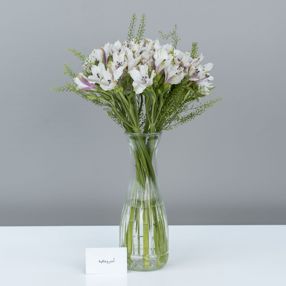 هذه الباقة تحتوي على زهور الأستروميريا، مرتبة بشكل جميل في فازة.