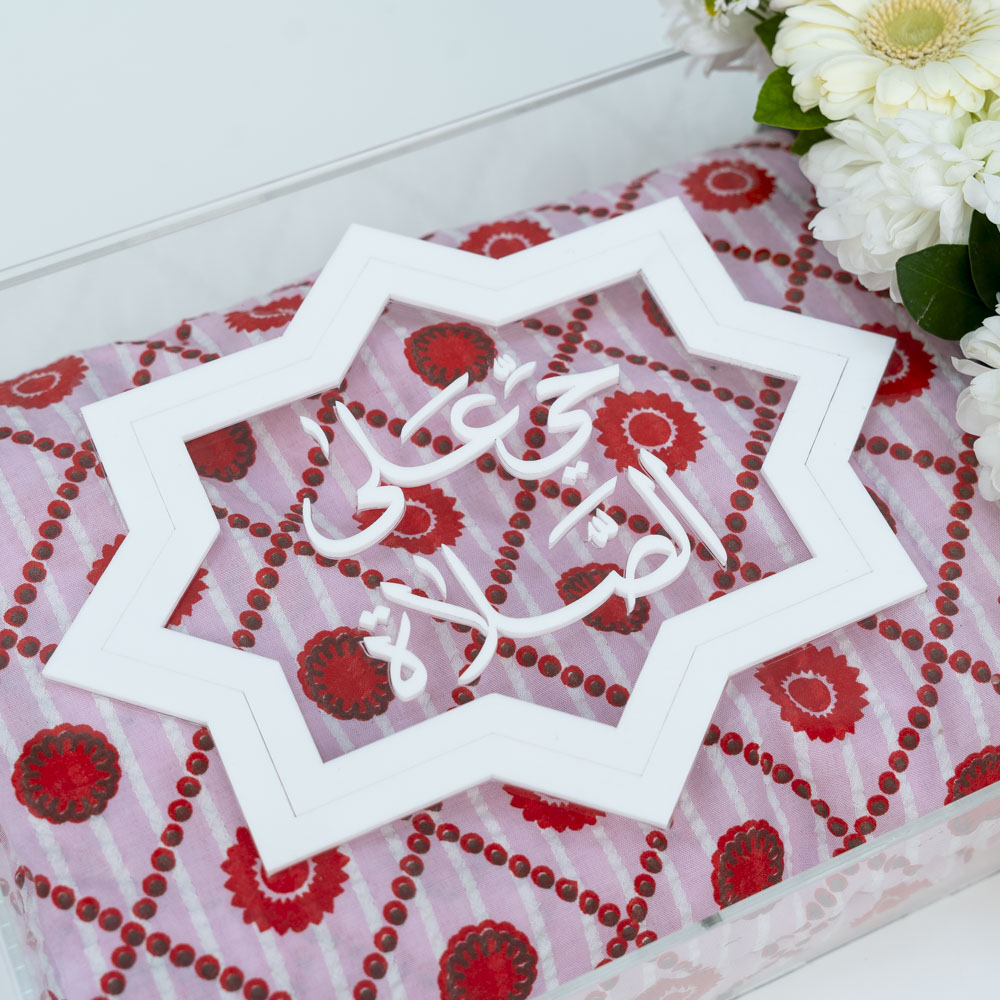 صندوق من الاكريليك مزين بزهور الكريزانتيمم والجيربيرا يحتوي على ثوب صلاة بنقشة جميلة.