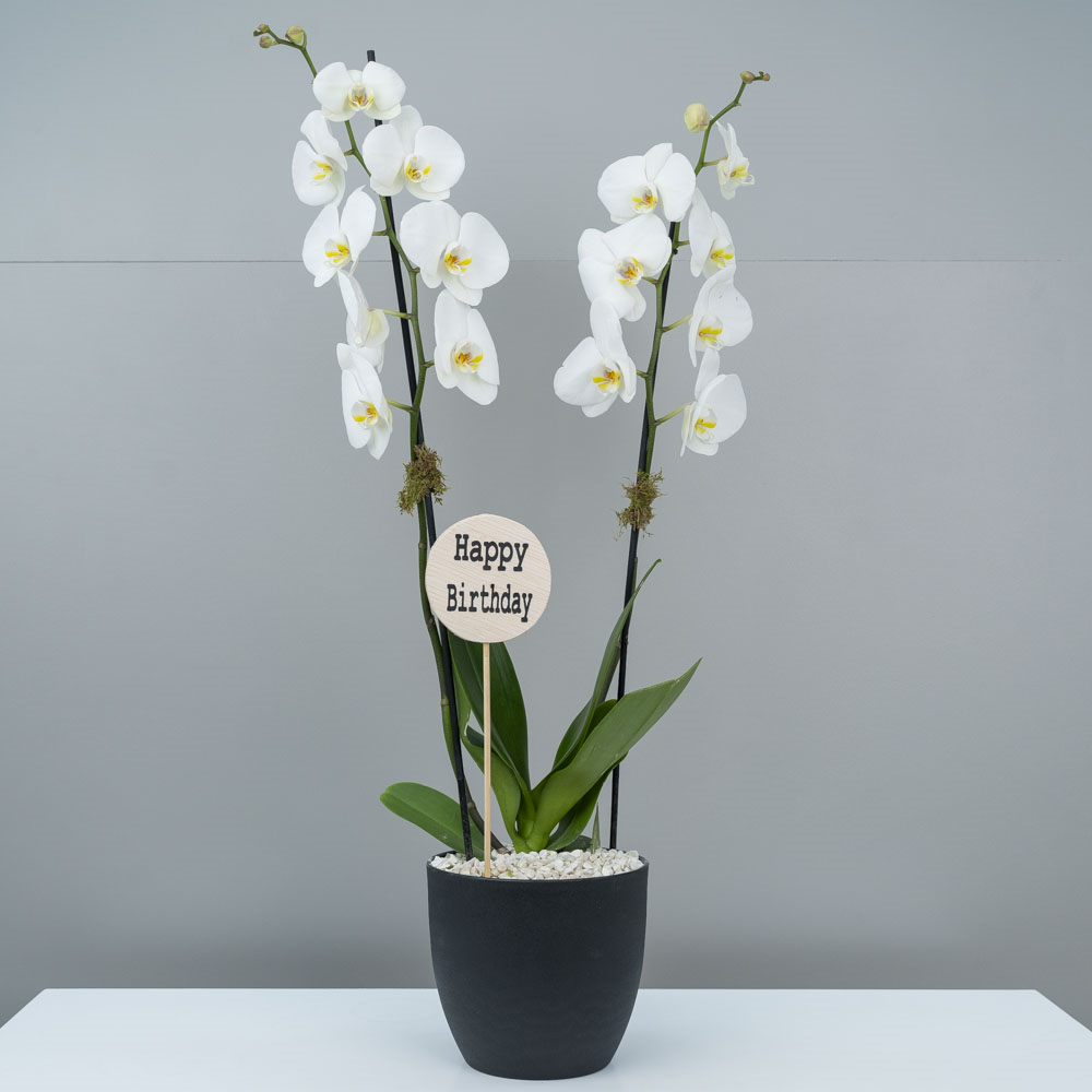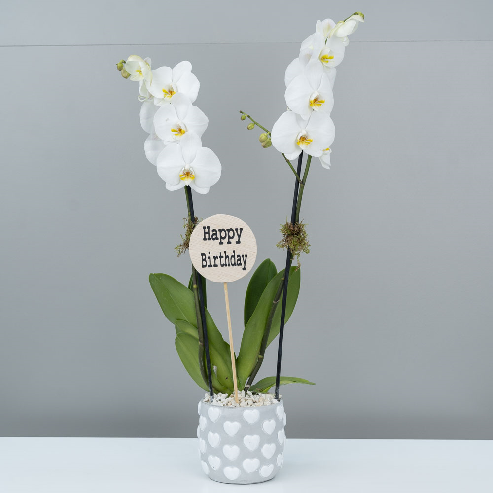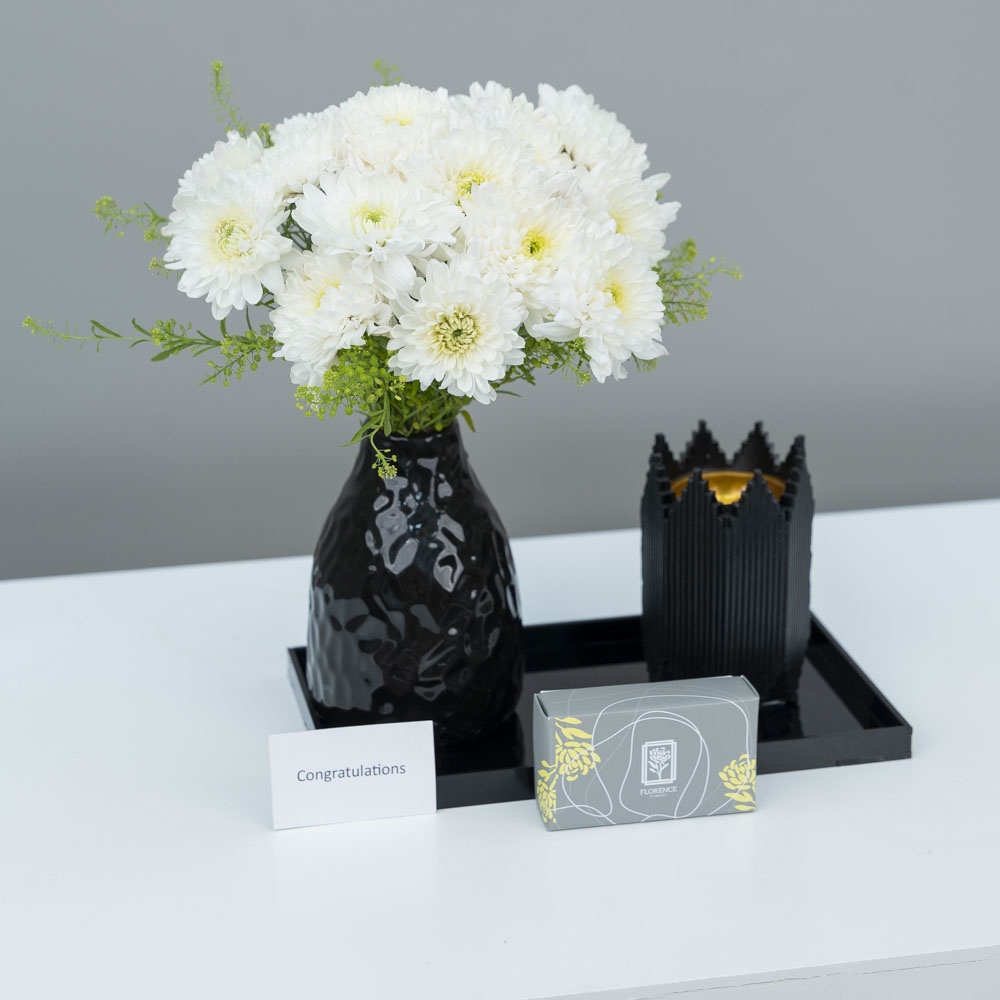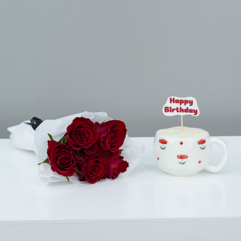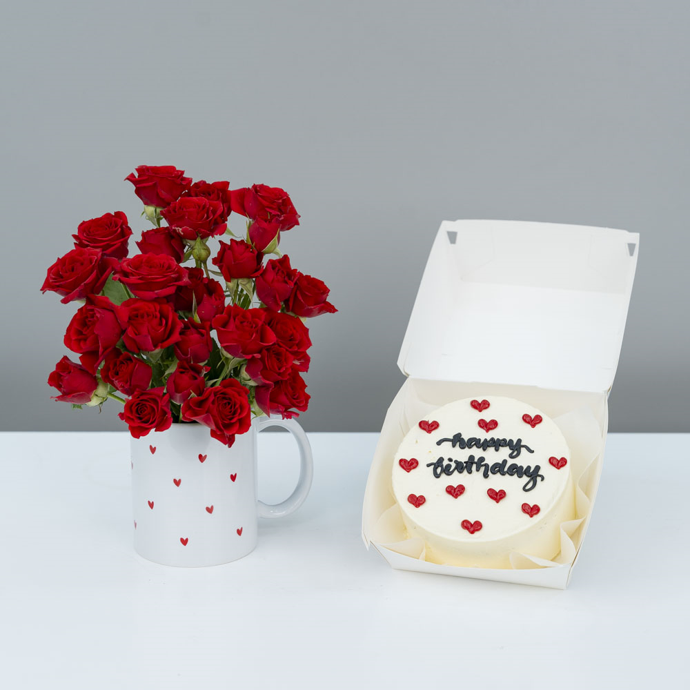 باقة يد مليئة بأزهار السترومريا والجربيرا مع كيكة الشوكولاتة.