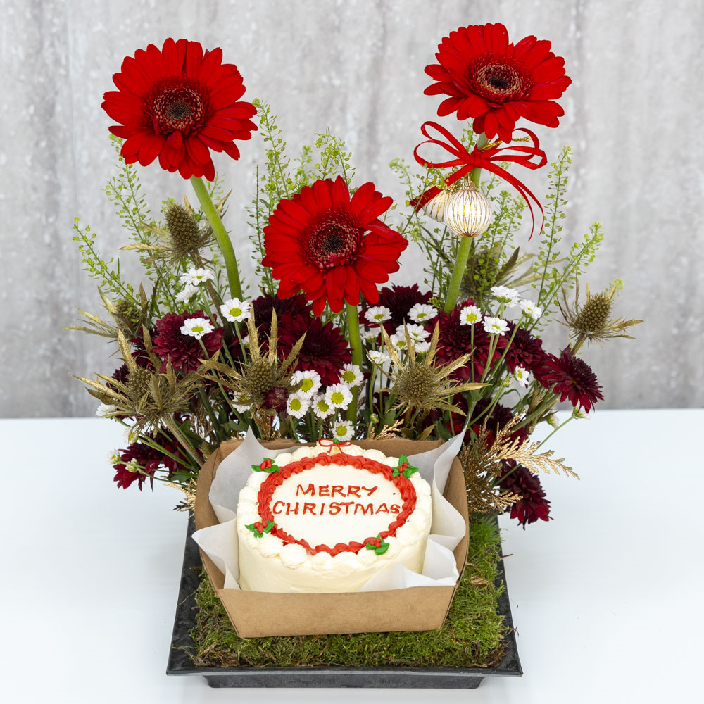 صينية مليئة بأزهار التوليب، الجوري والكرنيشن مع الشوكولاتة.