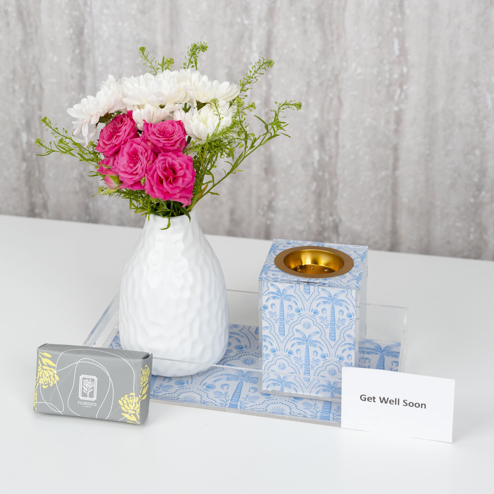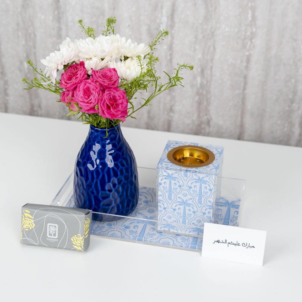 هذه الباقة تحتوي على زهور البيبي جوري والألستروميريا مع الشوكولاتة ومبخر.