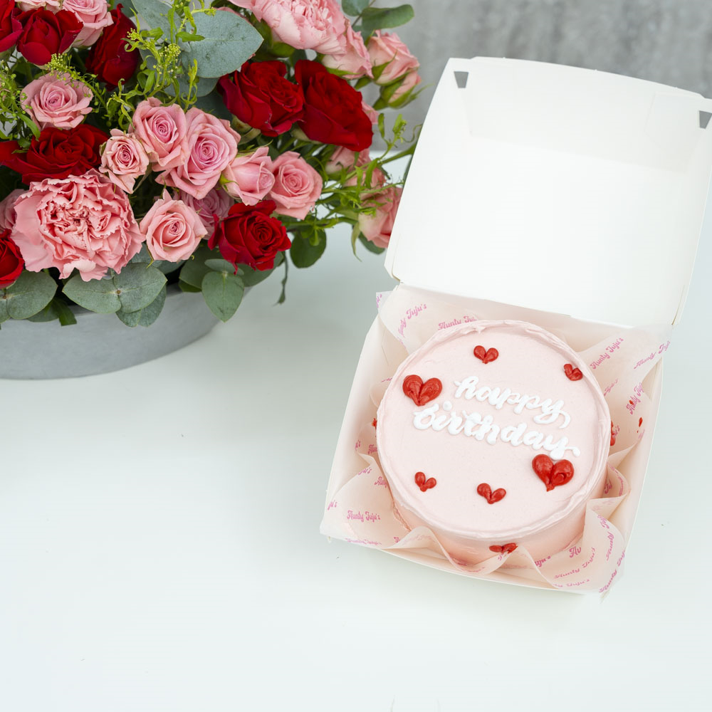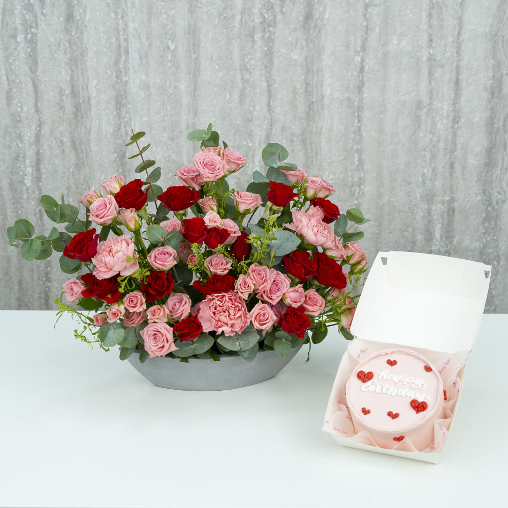 فازة تحتوي على الجوري، البيبي جوري والكارنيشن مع كيكة الشوكولاتة.
